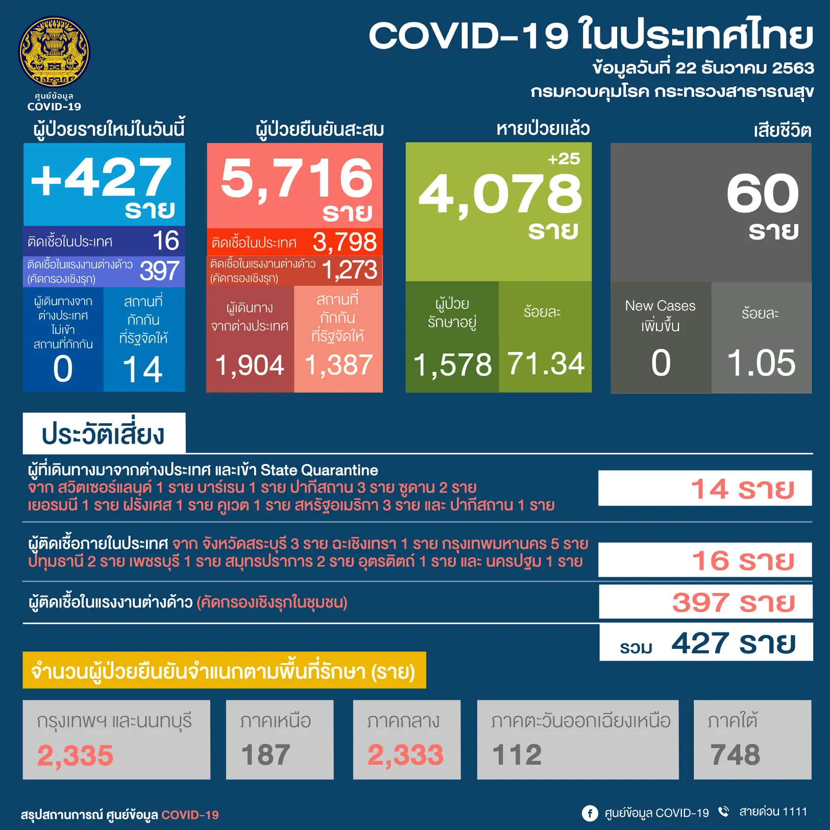 – พบผู้ป่วยรายใหม่เพิ่ม 427 ราย ซึ่งเป็นการติดเชื้อในประเทศ 16 ราย ที่เชื่อมโยงกับตลาดกลางกุ้ง จ.สมุทรสาคร โดยเป็นผู้ติดเชื้อใน สระบุรี 3 ราย ฉะเชิงเทรา 1 ราย กรุงเทพ 5 ราย ปทุมธานี 2 ราย เพชรบุรี 1 ราย สมุทรปราการ 2 ราย อุตรดิตถ์ 1 ราย นครปฐม 1 ราย และพบผู้ติดเชื้อจากการคัดกรองเชิงรุกในกลุ่มแรงงานต่างด้าวอีก 397 ราย