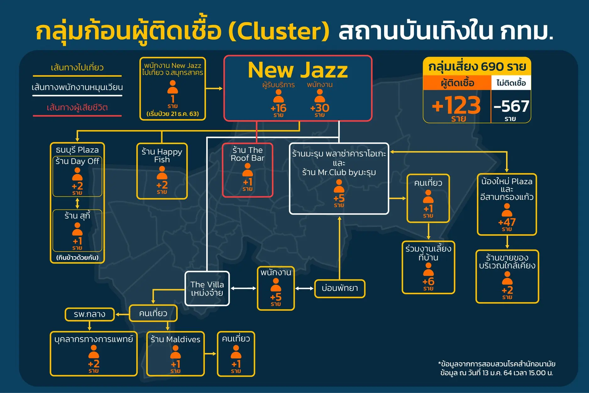 กรณี โควิดกรุงเทพ ผู้ติดเชื้อแบบกลุ่มหรือ Cluster จากสถานบันเทิง นาย พงศกร ขวัญเมือง โฆษกกรุงเทพมหานคร โพสต์ข้อความผ่านเพจเฟสบุ้ค เอิร์ธ พงศกร ขวัญเมือง – Earth Pongsakorn Kwanmuang ว่า กลุ่มก้อนผู้ป่วยติดเชื้อ (Cluster) ที่มีประวัติไปสถานบันเทิงในพื้นที่ กทม. จากการสอบสวนโรคและค้นหาผู้ป่วยติดเชื้อเชิงรุก พบผู้ติดเชื้อทั้งหมด 123 ราย ซึ่งมีทั้งพนักงานในสถานบันเทิง คนมาเที่ยว คนในครอบครัว และเพื่อน