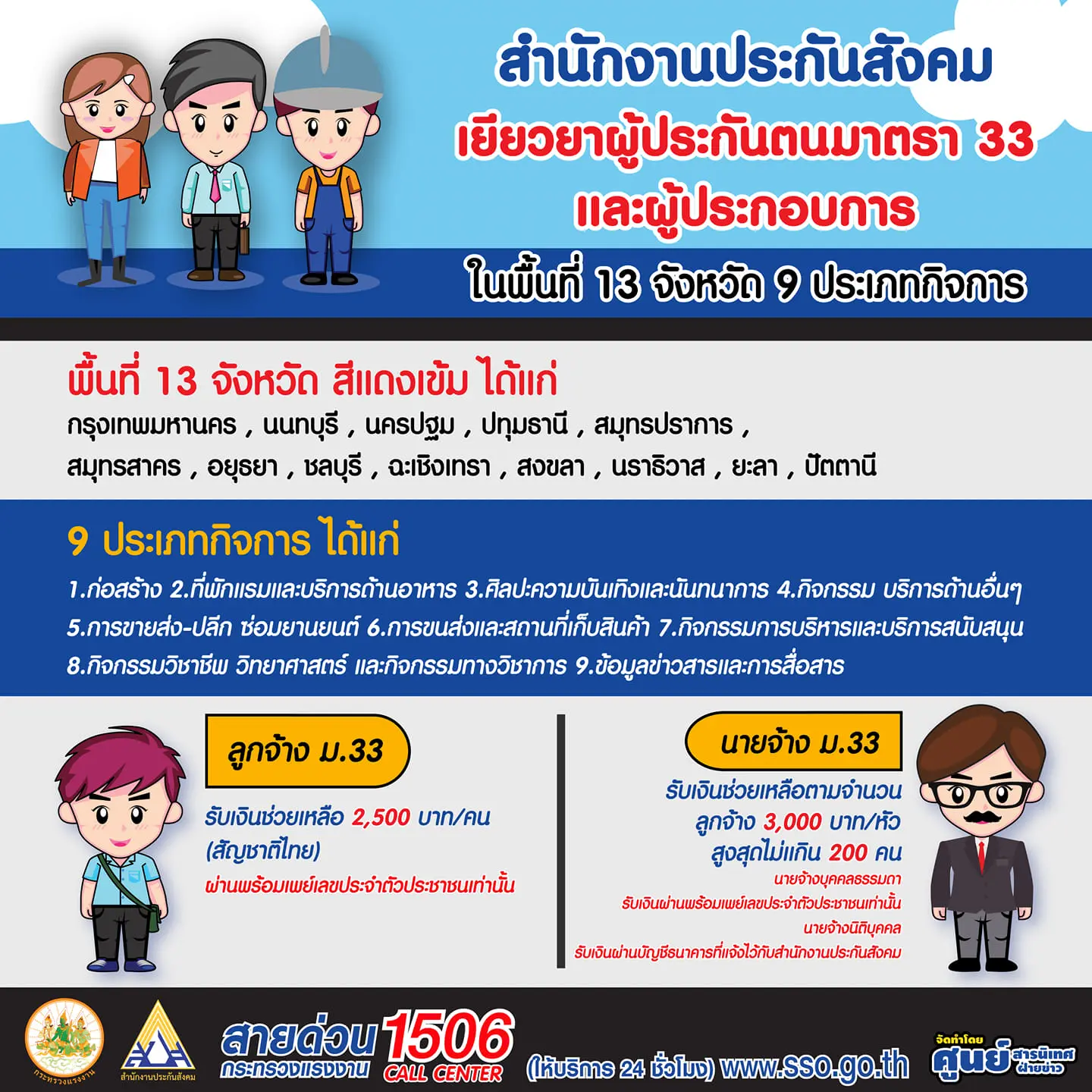 เมื่อวันที่ 4 สิงหาคม 2564 สำนักงานประกันสังคม กระทรวงแรงงาน ได้ทำการโอนเงินเยียวยาโควิดให้กับนายจ้างและลูกจ้างผู้ประกันตนมาตรา 33 ในกิจการที่ได้รับผลกระทบจากการแพร่ระบาดของเชิ้อไวรัสโควิด19 ในพื้นที่ควบคุมสูงสุดและเข้มงวด และพื้นที่จังหวัดชายแดนภาคใต้ จำนวน 13 จังหวัด ได้แก่ กรุงเทพมหานคร นนทบุรี นครปฐม ปทุมธานี สมุทรปราการ สมุทรสาคร พระนครศรีอยุธยา ชลบุรี ฉะเชิงเทรา สงขลา นราธิวาส ยะลา และ ปัตตานี