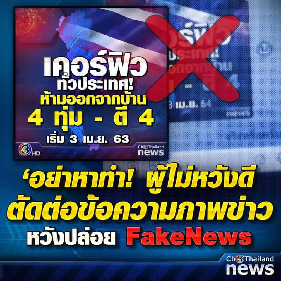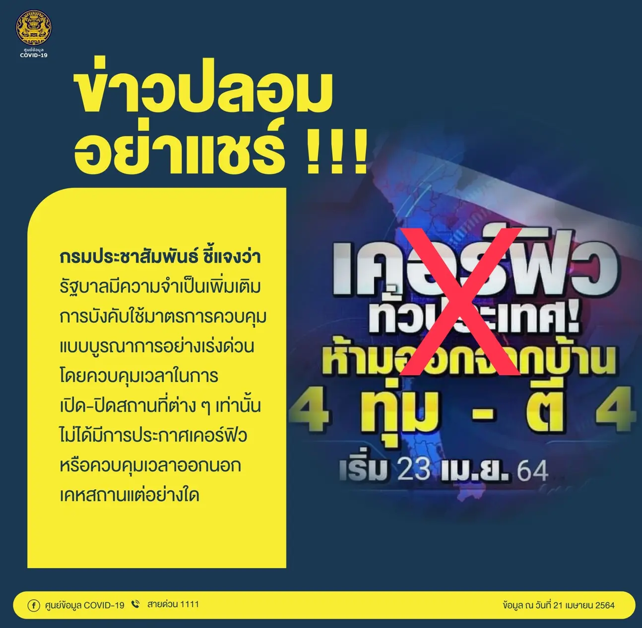 ศบค. เตือนประชาชนอย่าหลงเชื่อและแชร์ต่อ เคอร์ฟิว23เม.ย.64 เป็นข่าวปลอม กรมประชาสัมพันธ์ย้ำ ไม่มีเคอร์ฟิวประเทศไทย