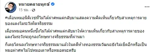 ล่าสุดจากกรณีดังกล่าว ทนายเดชา กิตติวิทยานันท์ ประธานเครือข่ายทนายคลายทุกข์ ได้โพสต์ผ่านเฟซบุ๊ก ทนายคลายทุกข์ เตือนหมอนิติเวช ท่านหนึ่ง โดยระบุข้อความว่า