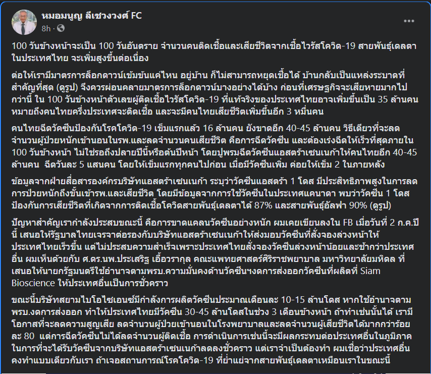 โควิดสายพันธุ์เดลต้า — เมื่อวันที่ 12 ส.ค. 2564 นพ.มนูญ ลีเชวงวงศ์ หรือ หมอมนูญ ผู้เชี่ยวชาญด้านระบบทางเดินหายใจ โรงพยาบาลวิชัยยุทธ โพสต์เฟซบุ๊ก หมอมนูญ ลีเชวงวงศ์ FC โดยระบุว่า 100 วันข้างหน้าจะเป็น 100 วันอันตราย จำนวนคนติดเชื้อและเสียชีวิตจากเชื้อไวรัสโควิด-19 สายพันธุ์เดลตาในประเทศไทย จะเพิ่มสูงขึ้นต่อเนื่อง
