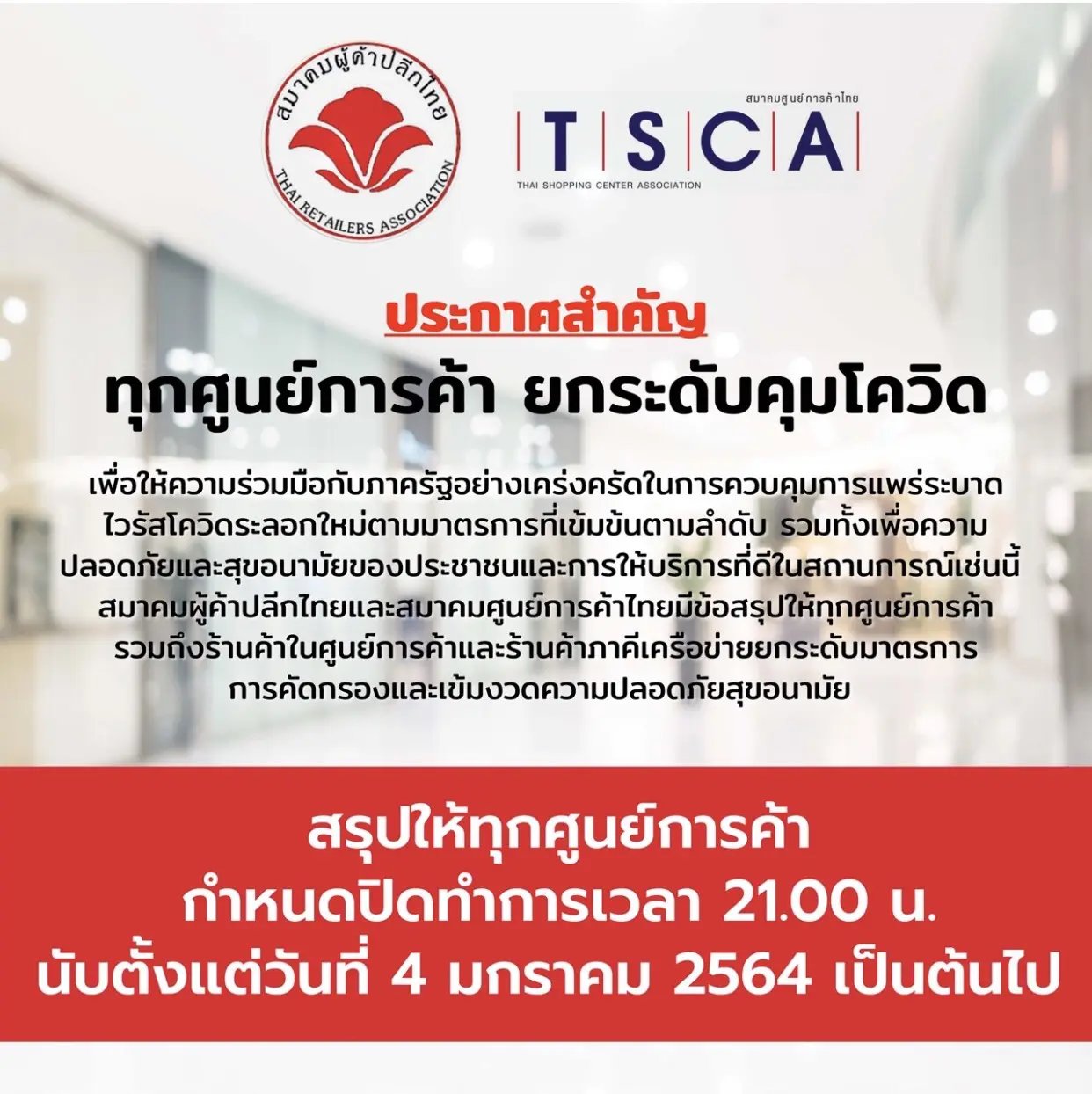 ห้างสรรพสินค้า สมาคมผู้ค้าปลีกไทยและสมาคมศูนย์การค้าไทย มีข้อสรุปให้ทุกศูนย์การค้า รวมถึงร้านค้าในศูนย์การค้าและร้านค้าภาคี เครือข่ายยกระดับมาตรการการคัดกรองและเข้มงวดความปลอดภัยสุขอนามัย และ สรุปให้ทุกศูนย์การค้ากำหนดปิดทำการเวลา 21.00 น. นับตั้งแต่วันที่ 4 มกราคม 2564 เป็นต้นไป