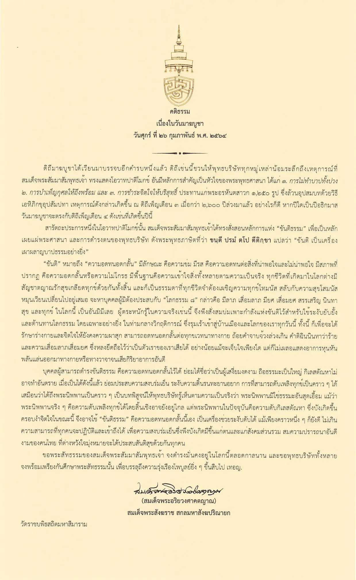 เนื่องในวันมาฆบูชา ๒๖ กุมภาพันธ์ ๒๕๖๔ เจ้าพระคุณ สมเด็จพระอริยวงศาคตญาณ สมเด็จพระสังฆราช สกลมหาสังฆปริณายก ประทานพระคติธรรม ความว่า