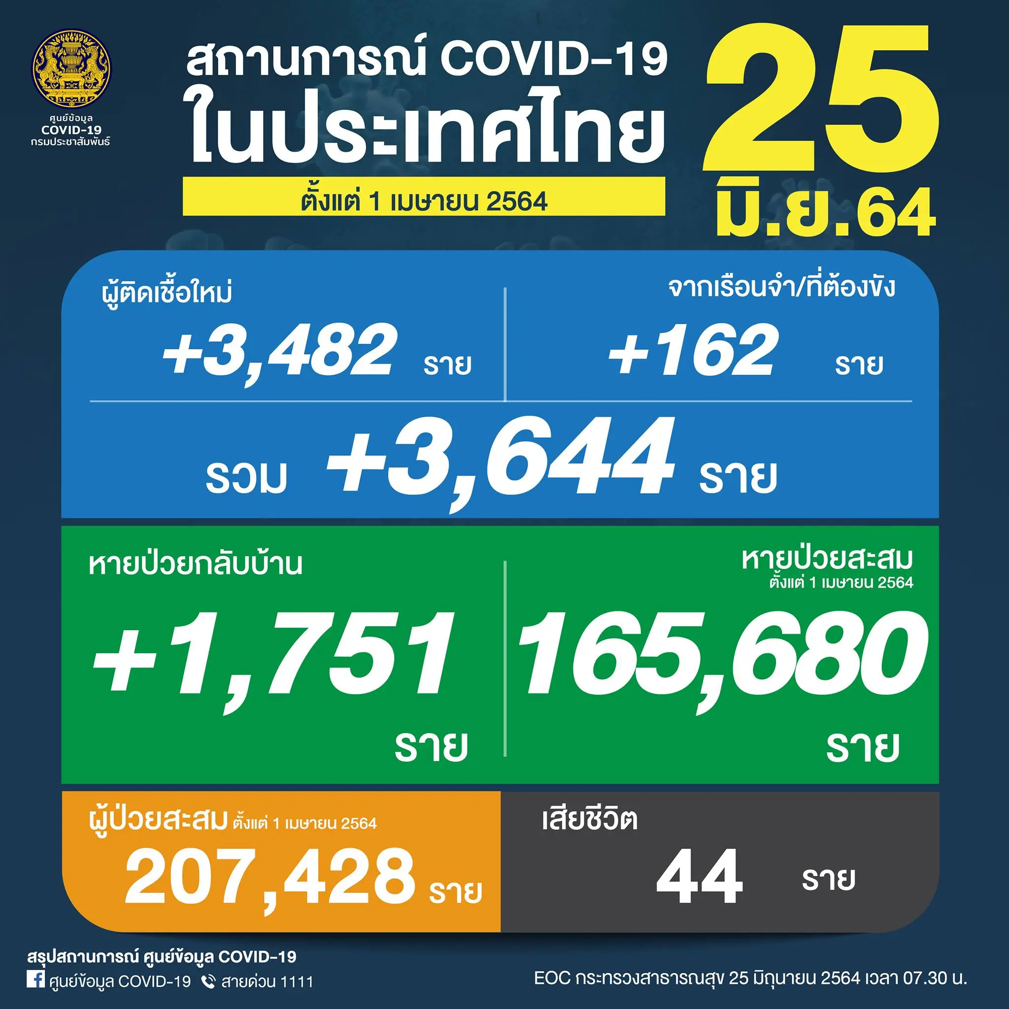 โควิดวันนี้ — เมื่อวันที่ 25 มิถนายน 2564 ศูนย์ข้อมูล COVID-19 รายงานยอดผู้ติดเชื้อ โควิด-19 โดยพบผู้ติดเชื้อรายใหม่เพิ่ม 3,482 ราย เสียชีวิต 44 ราย ทำให้การระบาดโควิด19 ระลอกใหม่ตั้งแต่เดือนเมษายน 2564 มียอดผู้เสียชีวิตรวม 1,725 ราย และยอดผู้เสียชีวิตสะสมจากการแพร่ระบาดของโควิด19 ตั้งแต่ปี 63 มีทั้งหมด 1,819 ราย สำหรับวันนี้มีรายงานผู้ติดเชื้อจากเรือนจำทั้งหมด 162 ราย รวมจำนวนผู้ติดเชื้อรายใหม่วันนี้ทั้งสิ้น 3,644 ราย