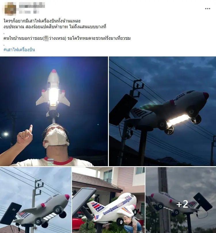 “ใครๆ ก็อยากมีเสาไฟเครื่องบินทั้งน้านแหละงบประมาณ สองร้อยแปดสิบห้าบาท ไม่ถึงแสนแบบบางที่ คนในบ้านบอกว่าชอบ(….ว่างเหรอ) รอโควิทหมดจะชวนฝรั่งมาเที่ยวชม #เสาไฟเครื่องบิน”