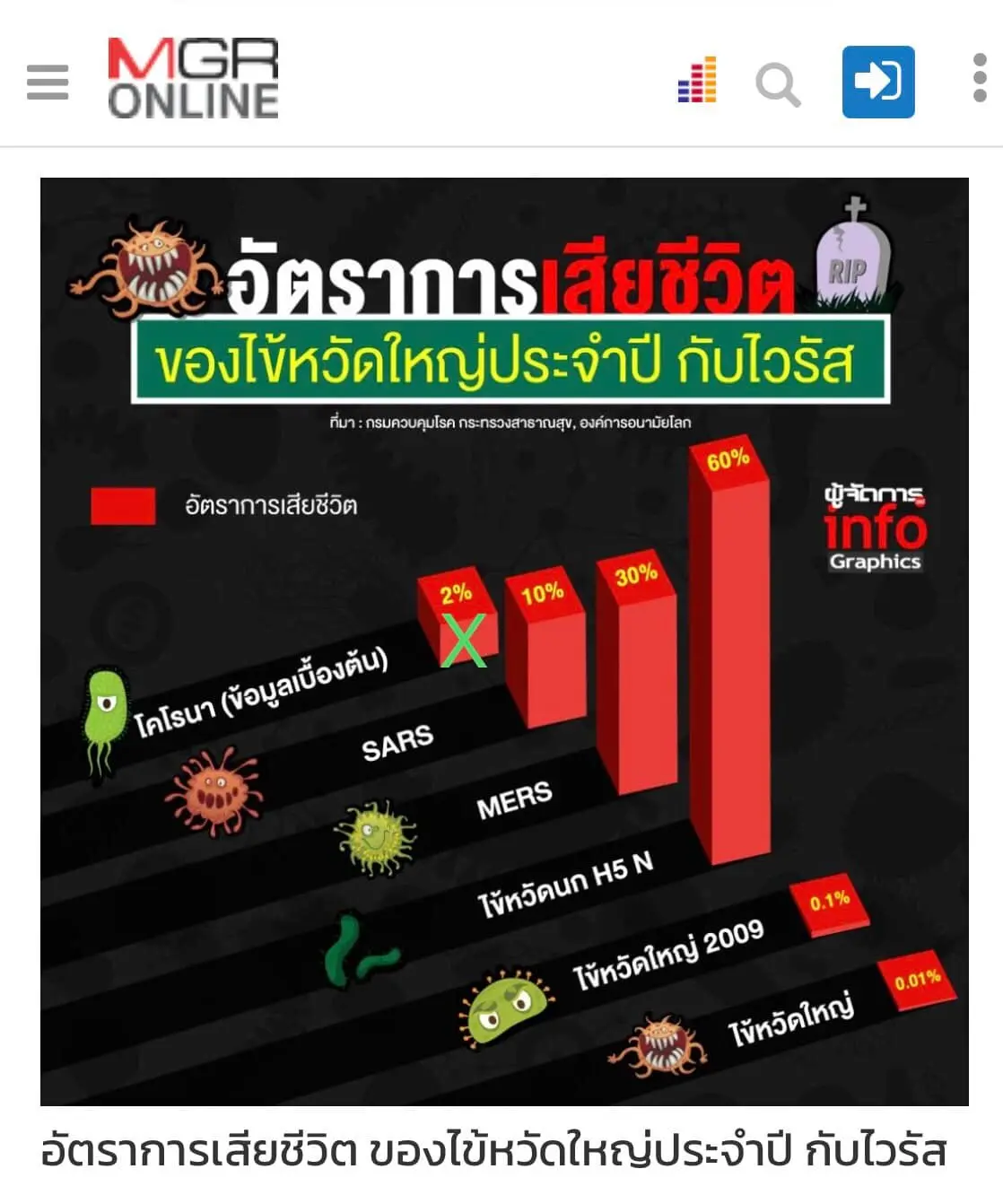 ไม่มีใครมาสั่งปิดโรงพยาบาลเมื่อพบบุคลากรทางการแพทย์และเจ้าหน้าที่ติดเชื้อไวรัสโควิด-19 โรงพยาบาลปฎิบัติกับคนติดเชื้อไวรัสโควิด-19 เช่นเดียวกับคนติดเชื้อไวรัสไข้หวัดใหญ่ อัตราตายของโรคโควิด-19 ในประเทศไทย ร้อยละ 0.1 (ไม่ใช่ร้อยละ 2) พอๆกับไข้หวัดใหญ่ปี 2009 แต่ไข้หวัดใหญ่ตามฤดูกาลอัตราตายน้อยกว่าประมาณร้อยละ 0.03 (ดูรูป) ประเทศไทยไม่มีการประกาศล็อกดาวน์ช่วงที่มีการระบาดของไข้หวัดใหญ่ปี 2009