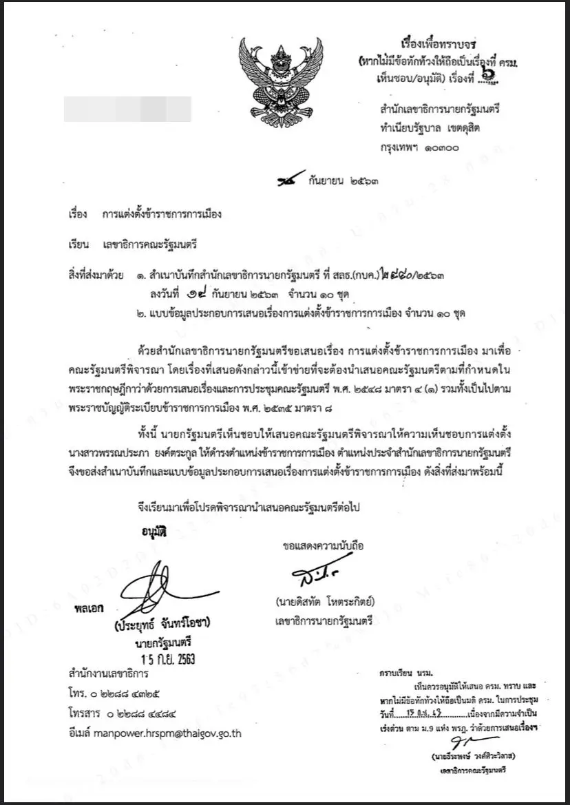 วันนี้ 15 ก.ย. 63 ในโลกออนไลน์ได้มีการเผยแพร่ หนังสือแต่งตั้งข้าราชการการเมือง ตำแหน่งประจำสำนักเลขาธิการนายกรัฐมนตรี โดยในหนังสือดังกล่าวนั้น ระบุ นายกรัฐมนตรีเห็นชอบให้เสนอคณะรัฐมนตรี (ครม.) ให้แต่งตั้ง พญ.พรรณประภา ยงค์ตระกูล ให้ดำรงตำแหน่งข้าราชการการเมือง ประจำสำนักเลขาธิการนายกรัฐมนตรี