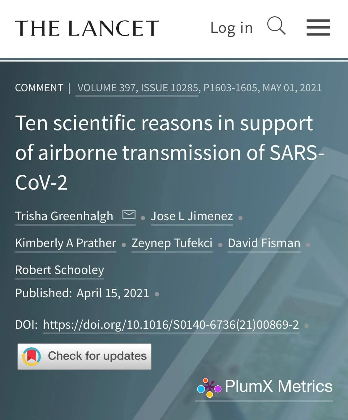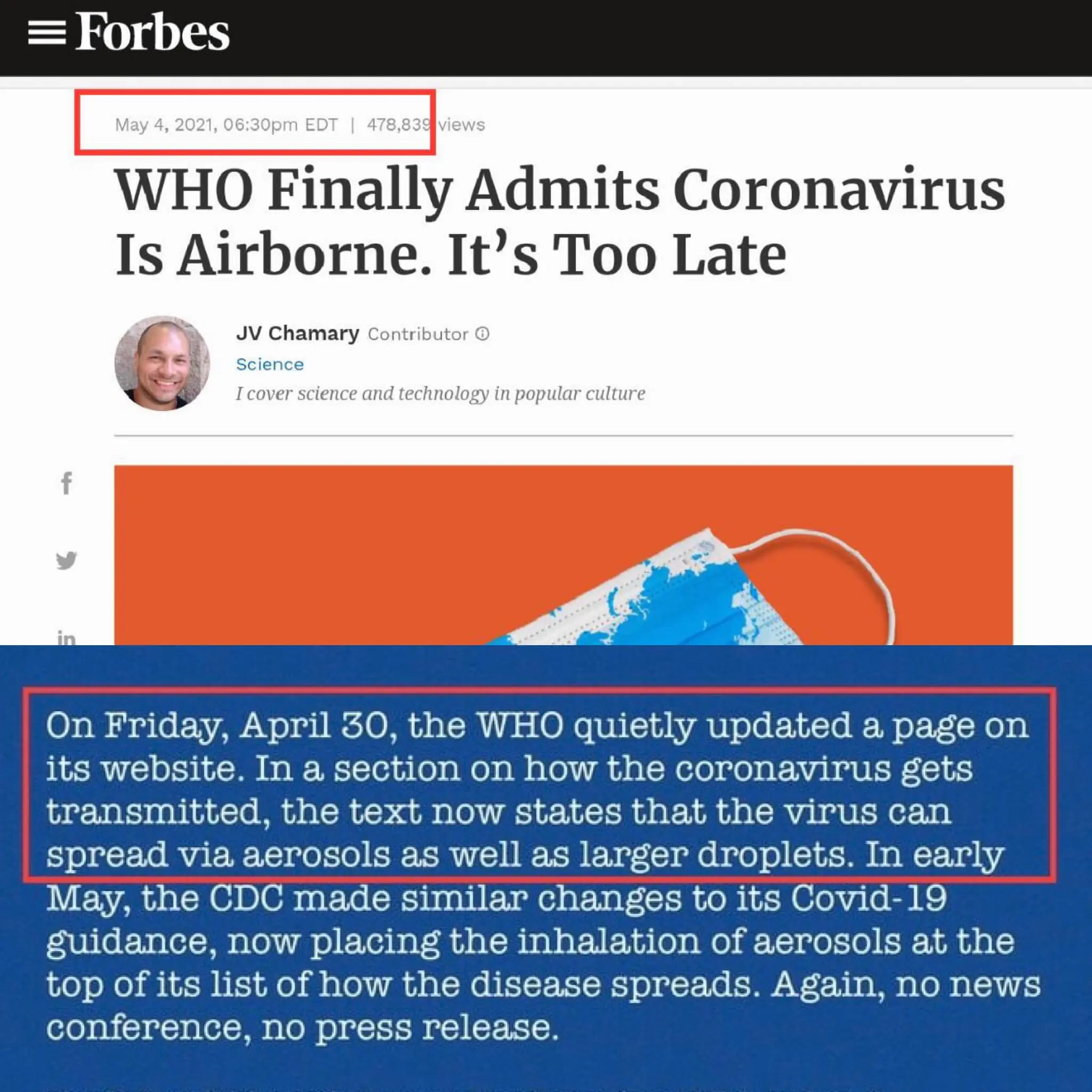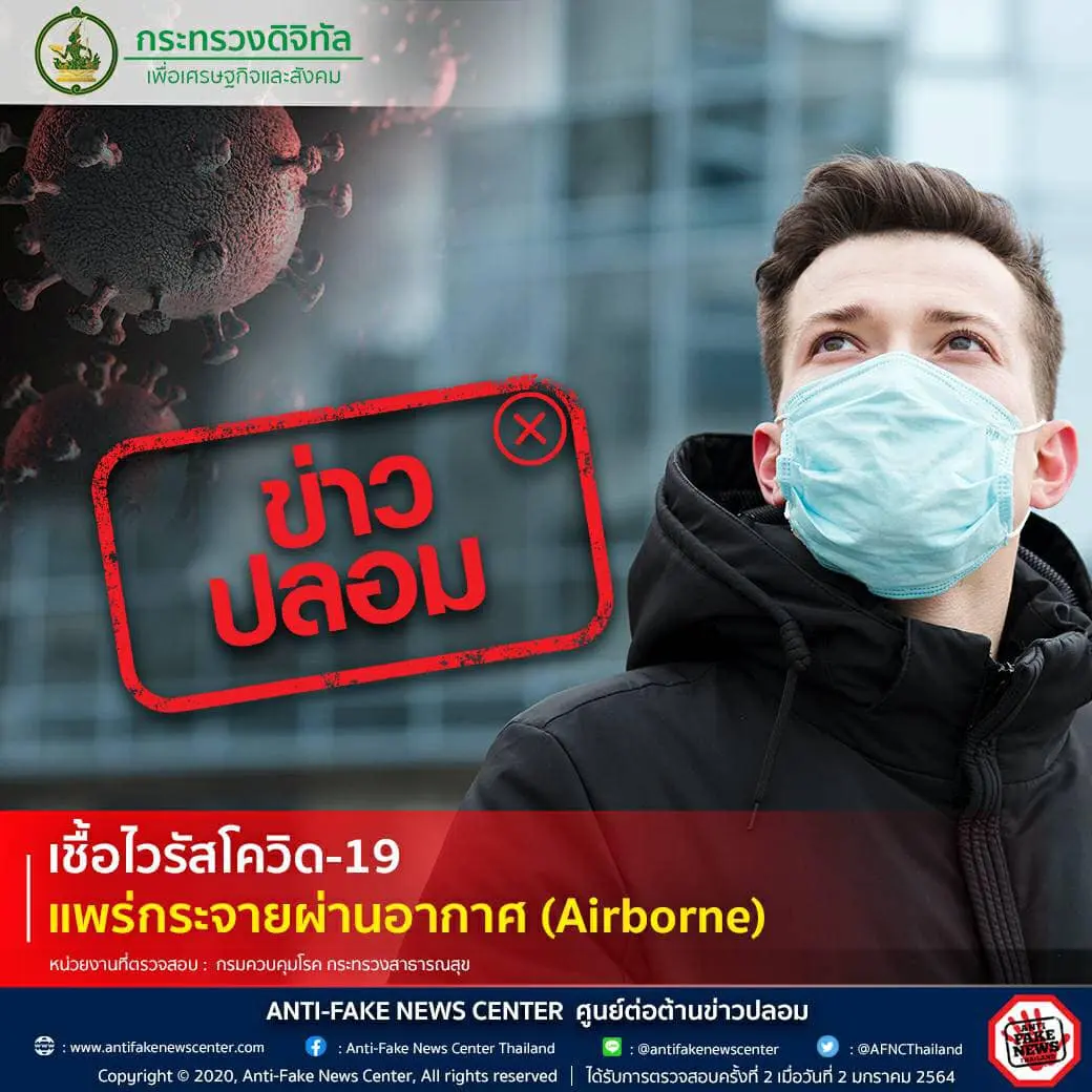 ล่าสุดคุณหมอมนุญ ลีเชวงวงศ์ แพทย์เฉพาะทางด้านโรคระบบการหายใจ โรงพยาบาลวิชัยยุทธ โพสต์เฟซบุ๊ก “หมอมนูญ ลีเชวงวงศ์ FC” ระบุว่า “ใครรู้จักศูนย์ต่อต้านข่าวปลอม กระทรวงดิจิทัล ช่วยกรุณาแจ้งศูนย์ฯที่สรุปว่า ”เชื้อไวรัสโควิด-19 แพร่กระจายผ่านอากาศ (Airborne)” เป็นข่าวปลอม ตั้งแต่ 2 มกราคม 2564 (ดูรูป) ปัจจุบันองค์การอนามัยโลกยอมรับแล้วว่าเชื้อไวรัสโควิด-19 แพร่กระจายได้ทางอากาศ (ดูรูป)”