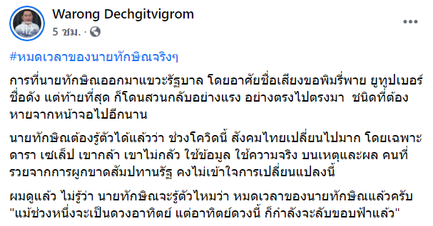 นายทักษิณต้องรู้ตัวได้แล้วว่า ช่วงโควิดนี้ สังคมไทยเปลี่ยนไปมาก โดยเฉพาะดารา เซเล็ป เขากล้า เขาไม่กลัว ใช้ข้อมูล ใช้ความจริง บนเหตุและผล คนที่รวยจากการผูกขาดสัมปทานรัฐ คงไม่เข้าใจการเปลี่ยนแปลงนี้
