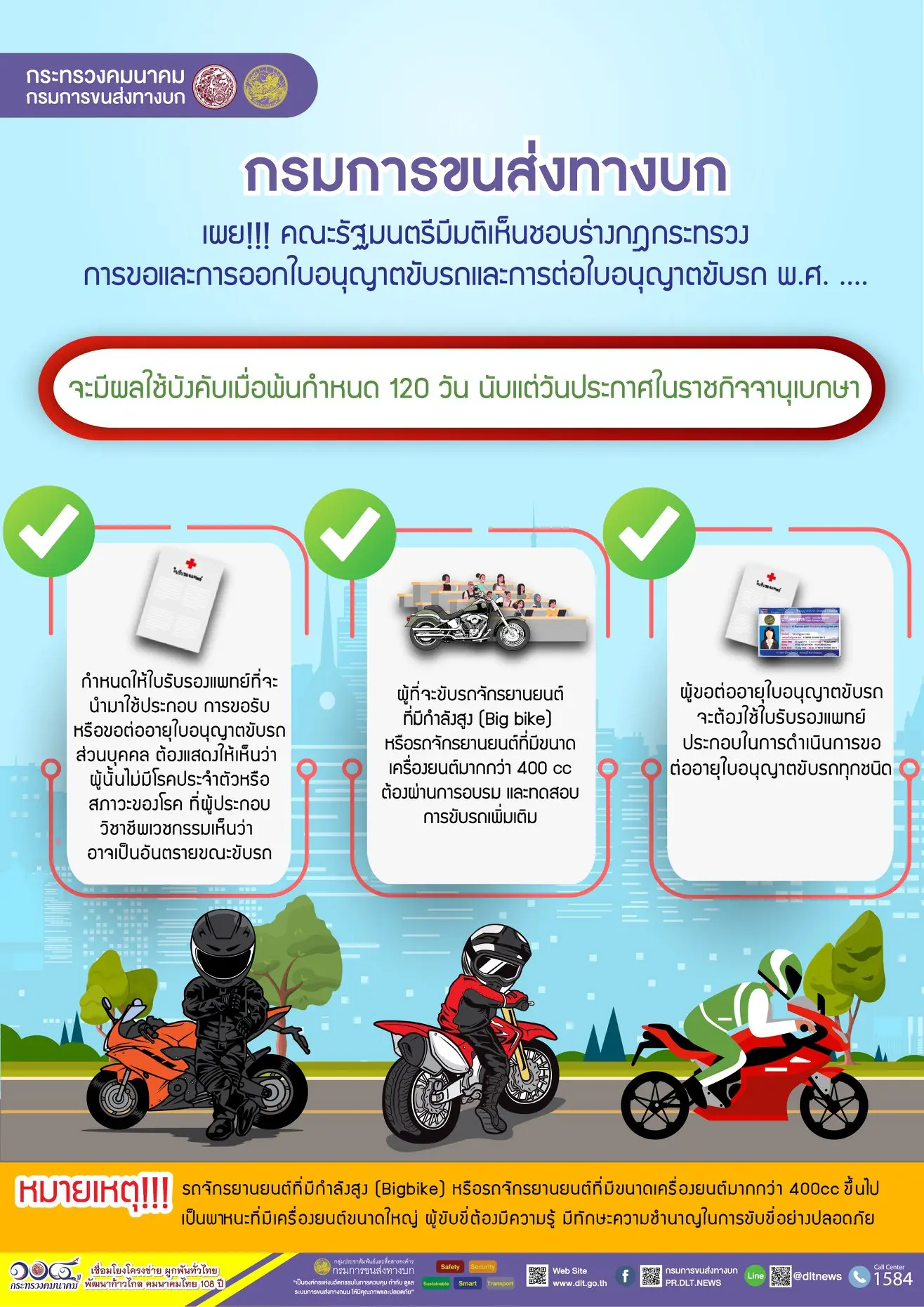 ครม. เห็นชอบร่างกฎกระทรวง ใบขับขี่บิ๊กไบค์ ต้องทำเรื่องขอและออกใบอนุญาตขับรถ ต้องผ่านการอบรมและทดสอบการขับรถเพิ่มเติม