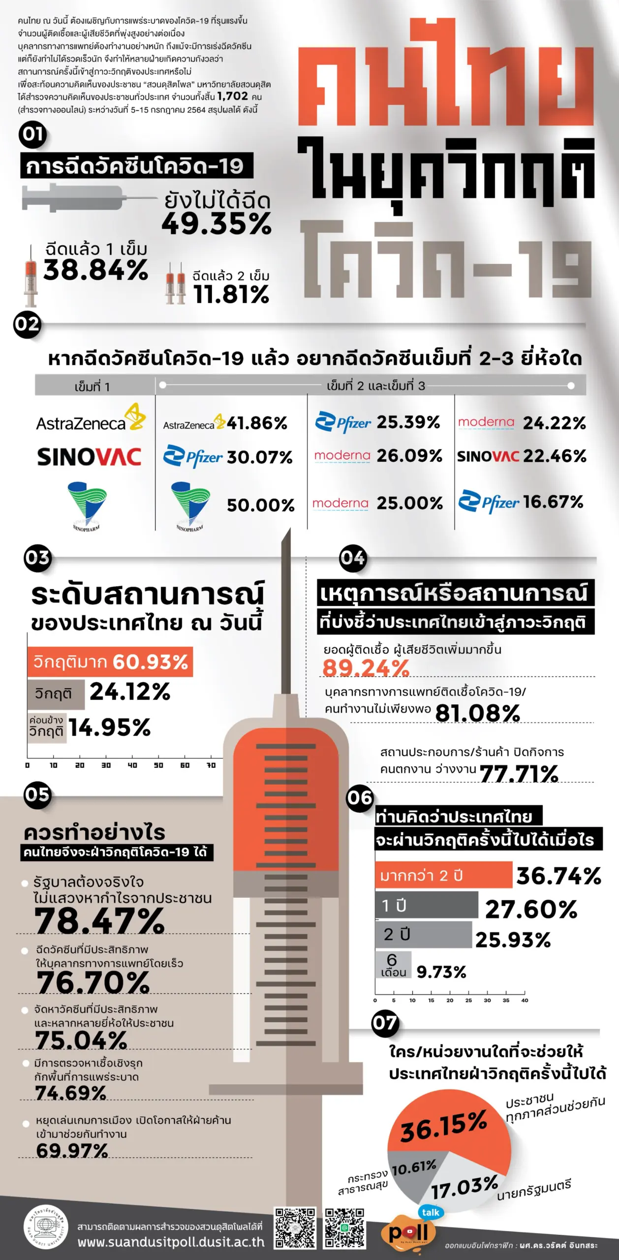 นางสาวพรพรรณ บัวทอง นักวิจัย สวนดุสิตโพล มหาวิทยาลัยสวนดุสิต กล่าวว่า ‘องค์การอนามัยโลก (WHO) ได้ออกมาเตือนว่าสถานการณ์โควิด-19 นั้นยังห่างไกลจุดจบ โลกอาจจะต้องเผชิญกับการกลายพันธุ์ของไวรัส ส่วนในประเทศไทยเองก็ได้มีการเรียกร้องให้ฉีดวัคซีนชนิด mRNA ให้กับบุคลากรด่านหน้า และเร่งฉีดวัคซีนเพื่อสร้างภูมิคุ้มกันให้กับประชาชนโดยเร็ว แต่ด้วยยังไม่มีวัคซีนให้ฉีด โคแวกซ์ (COVAX) ก็ไม่ได้เข้าร่วมการเจรจาเพื่อต่อรองนำเข้าวัคซีนก็ยังไม่เห็นความชัดเจน จำนวนผู้ติดเชื้อและผู้เสียชีวิตจำนวนมากขึ้นโดยยังไม่มีแนวโน้มว่าจะลดลง สะท้อนให้เห็นว่าคนไทยอยู่ใน “ยุควิกฤติโควิด-19” นั้นไม่เกินจริง’