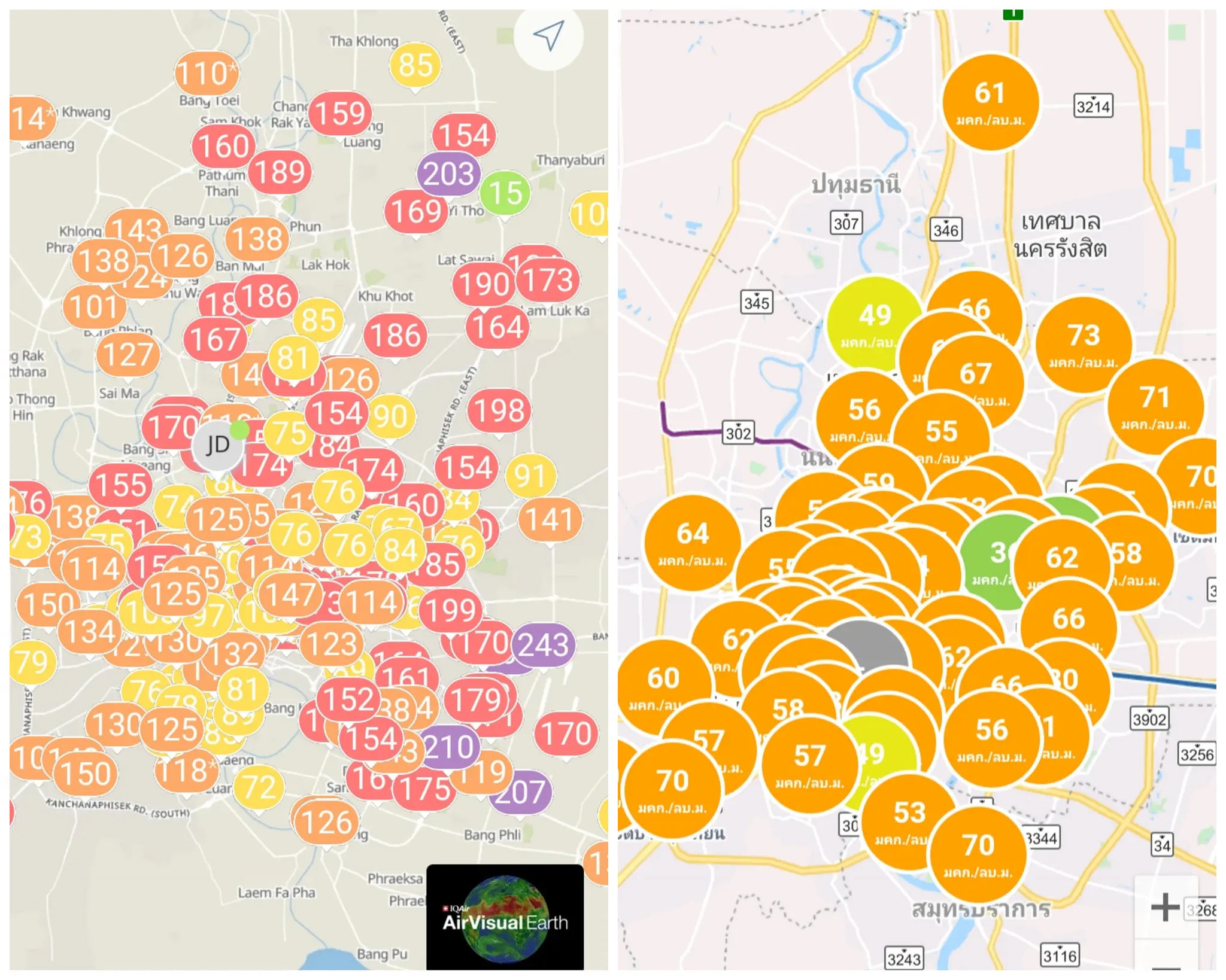 นี่ขนาดรอให้แดดออกจนความชื้นในอากาศต่ำลงแล้ว (ค่าความชื้นสัมผัสในอากาศสูงเกิน 80% จะทำให้เครื่องวัดพวกนี้เพี้ยนได้) แล้วก็ตั้งค่าดัชนีคุณภาพอากาศ aqi ของแอพ air visual (รูปซ้าย) เป็นแบบ china แล้วนะ ยังขึ้นสีส้มสีแดงกันเลย ส่วนถ้าดูค่าคุณภาพอากาศของไทยจากแอพ air4thai ก็เตือนขึ้นสีส้มเช่นกัน