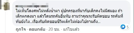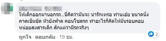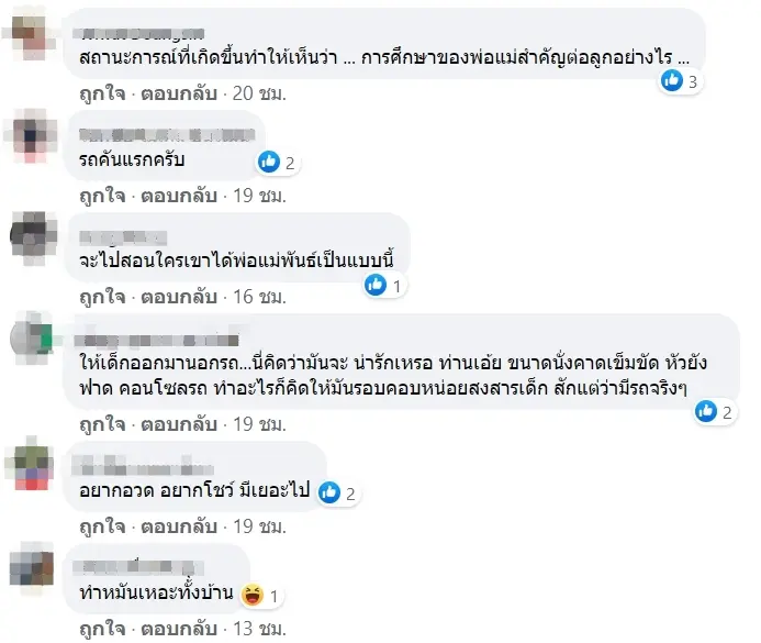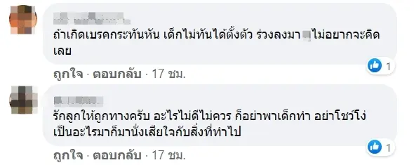 จากวิดีโอคลิปดังกล่าวได้มีชาวเน็ตที่เป็นสมาชิกของกลุ่มเป็นจำนวนมากเข้ามาแสดงความคิดเห็นซึ่งบางรายได้ระบุข้อควาวว่า “แช่ขวาไม่พอ ให้ลูกออกมาเล่นนอกรถ ถ้าพลาดหล่นลงมารถที่แซงซ้ายหักหลบไม่ทัน..ก็ซวยหักหลบแล้วรถที่ตามหลังมาชนคันหักหลบ..ก็ซวยหักหลบทันแล้วเสียหลักตกถนนหรือพลิกคว่ำ..ก็ซวย มีแต่ความซวยตกที่คันอื่นหมดเลย สรุปแม่งมีแต่คนอื่นจะซวยเพราะการกระทำแบบนี้ นับวันการขับรถหรือการใช้ถนนเมืองไทยมันแปลกๆขึ้นทุกวันแล้ว” และนอกจากความคิดเห็นข้างต้นนี้ก็ยังมีอีกหลายข้อความที่เข้ามาท้วงติงการกระทำที่ปล่อยปละละเลย จนอาจก่อให้เกิดอุบัติเหตุบนท้องถนนครั้งนี้ได้