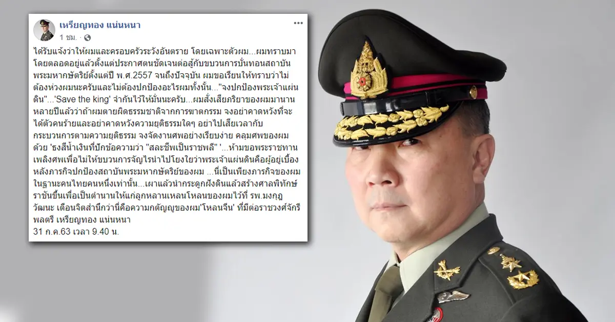 “ได้รับแจ้งว่าให้ผมและครอบครัวระวังอันตราย โดยเฉพาะตัวผม…ผมทราบมาโดยตลอดอยู่แล้วตั้งแต่ประกาศตนชัดเจนต่อสู้กับขบวนการบั่นทอนสถาบันพระมหากษัตริย์ตั้งแต่ปี พ.ศ.2557 จนถึงปัจจุบัน ผมขอเรียนให้ทราบว่าไม่ต้องห่วงผมนะครับและไม่ต้องปกป้องอะไรผมทั้งนั้น…”จงปกป้องพระเจ้าแผ่นดิน”…’Save the king’ จำกันไว้ให้มั่นนะครับ…ผมสั่งเสียภริยาของผมมานานหลายปีแล้วว่าถ้าผมตายผิดธรรมชาติจากการฆาตกรรม จงอย่าคาดหวังที่จะได้ตัวคนร้ายและอย่าคาดหวังความยุติธรรมใดๆ อย่าไปเสียเวลากับกระบวนการตามความยุติธรรม จงจัดงานศพอย่างเรียบง่าย คลุมศพของผมด้วย ‘ธงสีน้ำเงินที่ปักข้อความว่า “สละชีพเป็นราชพลี” ‘…ห้ามขอพระราชทานเพลิงศพเพื่อไม่ให้ขบวนการจัญไรนำไปโยงใยว่าพระเจ้าแผ่นดินคือผู้อยู่เบื้องหลังภารกิจปกป้องสถาบันพระมหากษัตริย์ของผม …นี่เป็นเพียงภารกิจของผมในฐานะคนไทยคนหนึ่งเท่านั้น…เผาแล้วนำกระดูกฝังดินแล้วสร้างศาลพิทักษ์ราชันขึ้นเพื่อเป็นตำนานให้แก่ลูกหลานเหลนโหลนของผมไว้ที่ รพ.มงกุฎวัฒนะ เตือนจิตสำนึกว่านี่คือความกตัญญูของผม’โหลนจีน’ ที่มีต่อราชวงศ์จักรี”