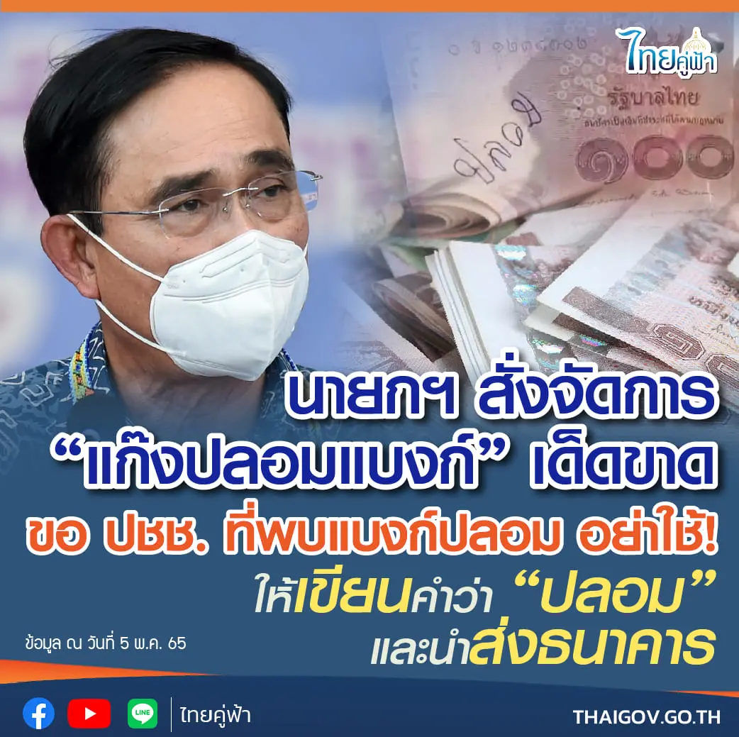 โดยล่าสุดเมื่อวันที่ 6 พฤษภาคม 2565 ทางด้านเพจเฟซบุ๊ก ไทยคู่ฟ้า ระบุว่า นายกฯ สั่งจัดการ “แก๊งปลอมแบงก์” อย่างเด็ดขาด โทษสูงสุดจำคุกตลอดชีวิต ขอประชาชนที่พบแบงก์ปลอม อย่าใช้! เขียนคำว่า “ปลอม” นำส่งธนาคาร.