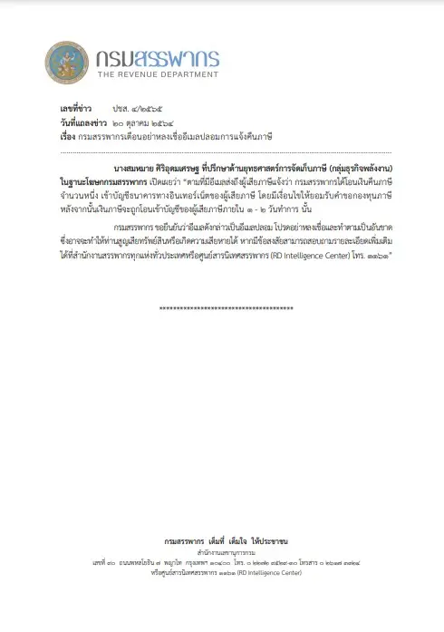 กรมสรรพากร ขอยืนยันว่าอีเมลดังกล่าวเป็นอีเมลปลอม โปรดอย่าหลงเชื่อและทำตามเป็นอันขาด ซึ่งอาจจะทำให้ท่านสูญเสียทรัพย์สินหรือเกิดความเสียหายได้ หากมีข้อสงสัยสามารถสอบถามรายละเอียดเพิ่มเติม ได้ที่สำนักงานสรรพากรทุกแห่งทั่วประเทศหรือศูนย์สารนิเทศสรรพากร (RD Intelligence Center) โทร. 1161