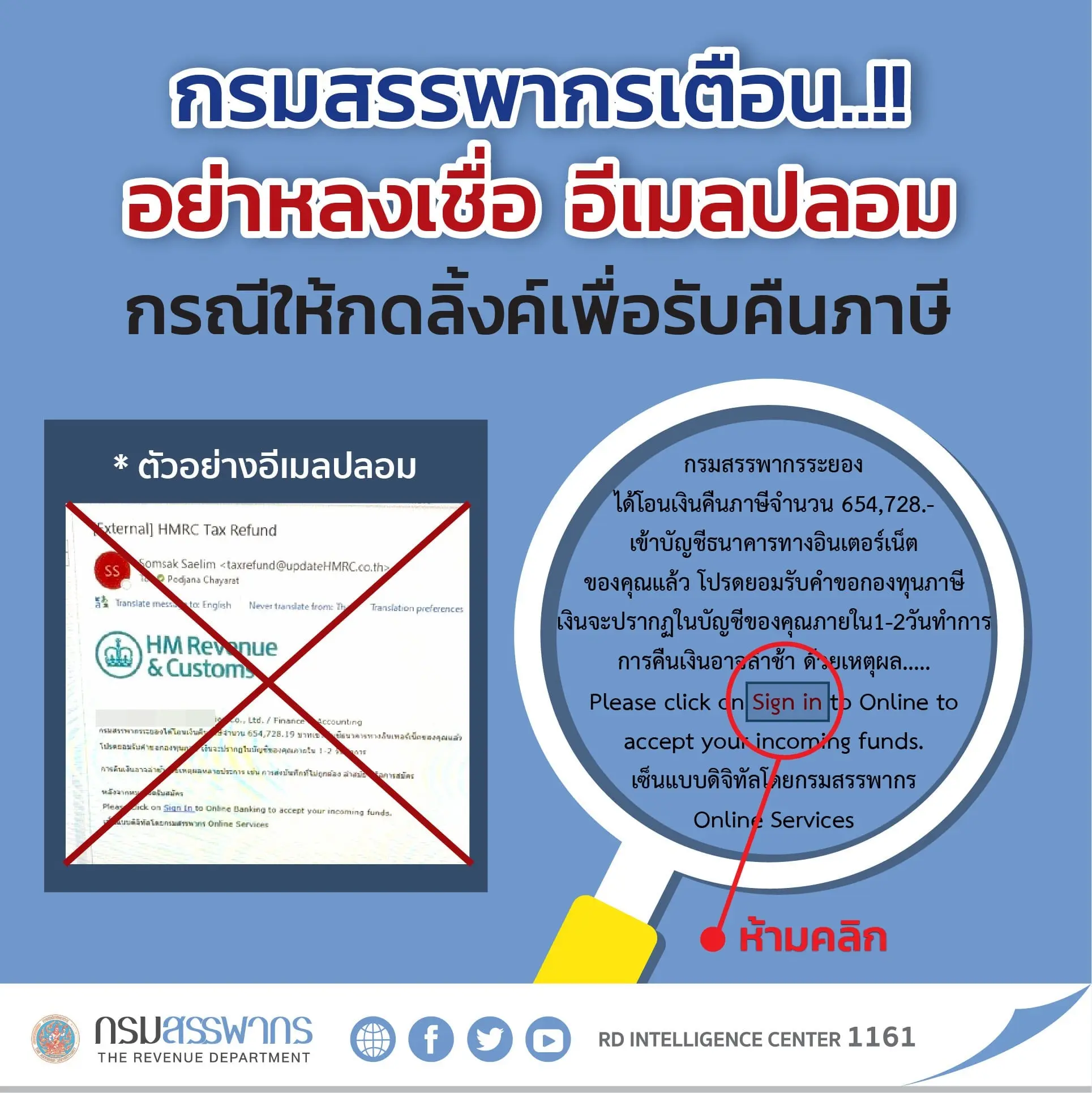 กรมสรรพากร เตือนประชาชน อย่าหลงเชื่อ อีเมลปลอม โอนคืนภาษี ชี้ไม่มีอยู่จริง หากทำตามอาจจะทำให้สูญเสียทรัพย์สินได้