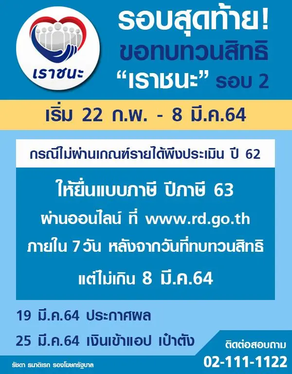 ทบทวนสิทธิเราชนะ — ดร. รัชดา ธนาดิเรก รองโฆษกรัฐบาล โพสต์ผ่านเฟซบุ๊กระบุว่า กระทรวงการคลังเปิดให้ ขอทบทวนสิทธิโครงการเราชนะ รอบที่ 2 เริ่มตั้งแต่วันนี้ (22 ก.พ.) – 8 มี.ค.64 ที่ www.เราชนะ .com