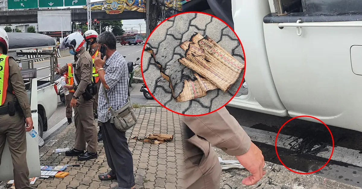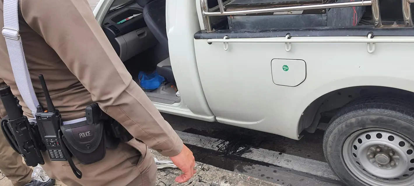 จึงรีบไปตรวจสอบ พบ พบผู้ขับขี่ และภรรยา ซึ่งอยู่ในอาการตกใจกลัวสุดขีด และ มีไฟลุกไหม้ บริเวณใต้ท้องรถ ใกล้กับถังน้ำมันของรถกระบะคันดังกล่าว เมื่อเจ้าหน้าที่ตำรว เข้าไปตรวจสอบพบว่า มีเศษวัสดุบางอย่าง ติดอยู่ใต้ท้องรถ ใกล้เพลารถ จึงทำให้ เกิดไฟลุกไหม้ขึ้น!