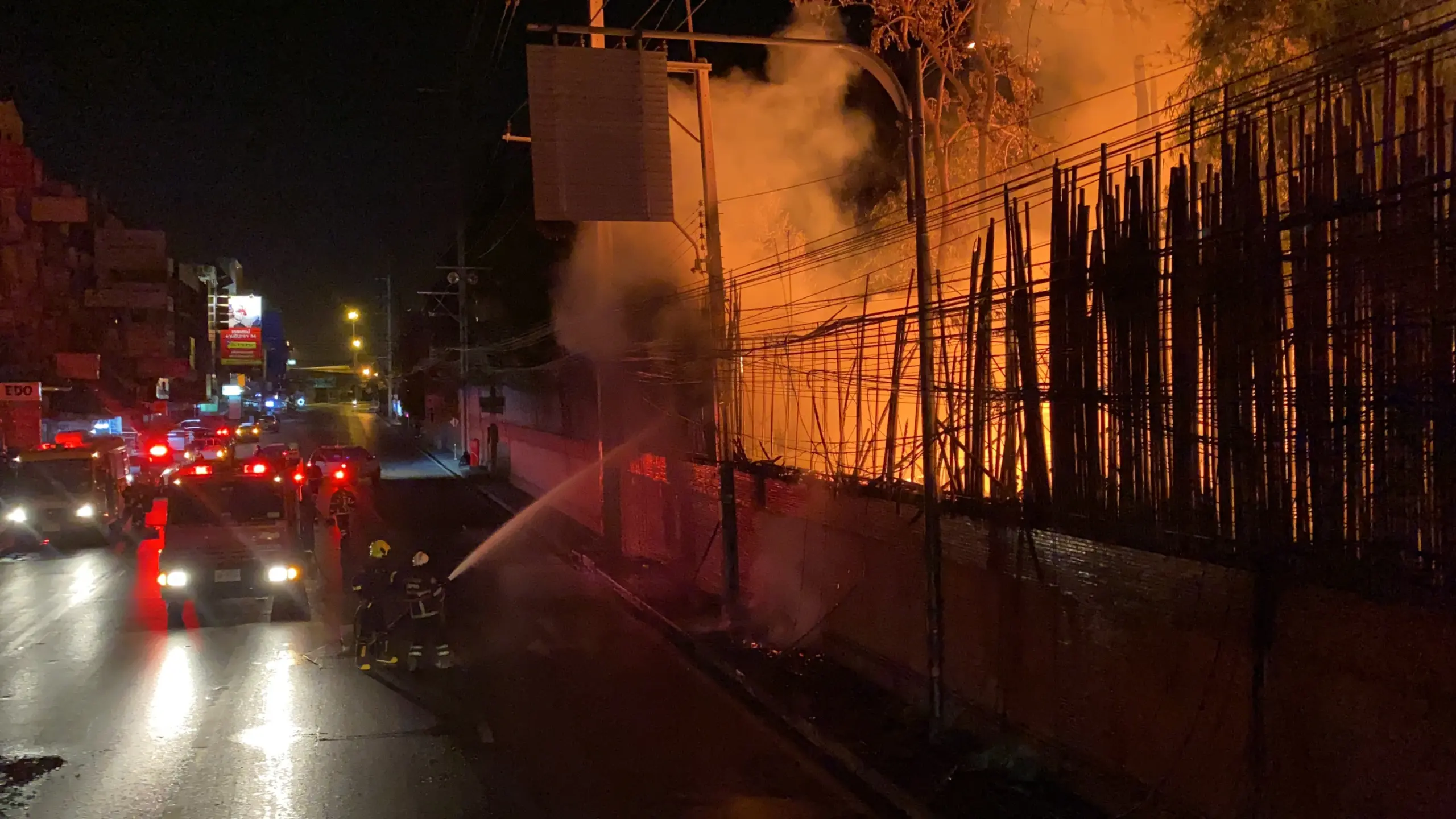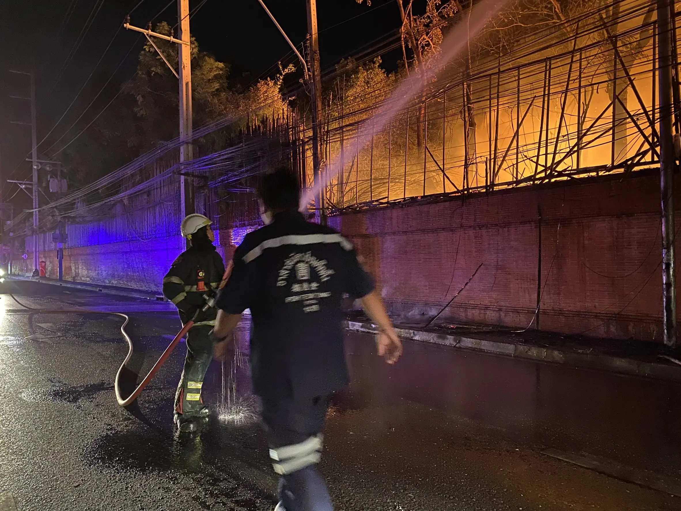 โดยไฟได้โหมลุกไหม้อย่างรุนแรง และลามเข้ารั้วไม้ที่อยู่ติดกันและลามเข้าไปในโกดังเก็บไม้ ที่อยู่ข้างในอย่างรวดเร็ว ซึ่งในโกดัง มีเศษไม้เก่า กิ่งไม้ท่องไม้ และหนังสือเก่า ซึ่งเป็นเชื่อเพลิงอย่างดี