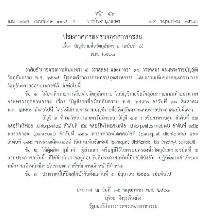 สารเคมีอันตราย วันที่ 19 พ.ค.63 เว็บไซต์ราชกิจจานุเบกษา เผยแพร่ประกาศ ลงนามโดย นายสุริยะ จึงรุ่งเรืองกิจ รัฐมนตรีว่าการกระทรวงอุตสาหกรรม ประกาศกระทรวงอุตสาหกรรม เรื่อง บัญชีรายชื่อวัตถุอันตราย (ฉบับที่6) พ.ศ.2563