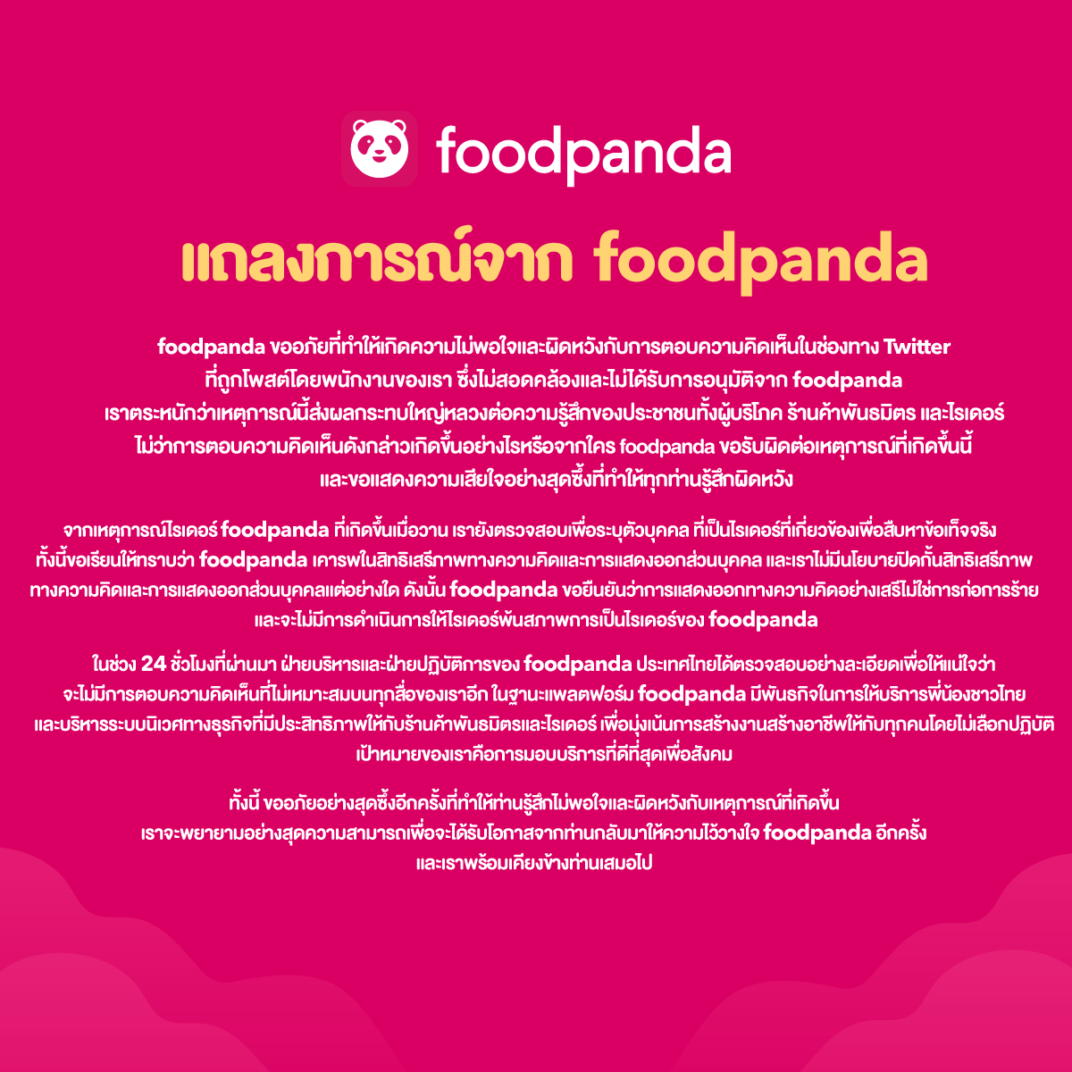 ในช่วง 24 ชั่วโมงที่ผ่านมา ฝ่ายบริหารและฝ่ายปฏิบัติการของ foodpanda ประเทศไทยได้ตรวจสอบอย่างละเอียดเพื่อให้แน่ใจว่าจะไม่มีการตอบความคิดเห็นที่ไม่เหมาะสมบนทุกสื่อของเราอีก ในฐานะเพลตฟอร์ม foodpanda มีพันธกิจในการให้บริการพี่น้องชาวไทยและบริหารระบบนิเวศทางธุรกิจที่มีประสิทธิภาพให้กับร้านค้าพันธมิตรและไรเดอร์ เพื่อมุ่งเน้นการสร้างงานสร้างอาชีพให้กับทุกคนโดยไม่เลือกปฏิบัติ