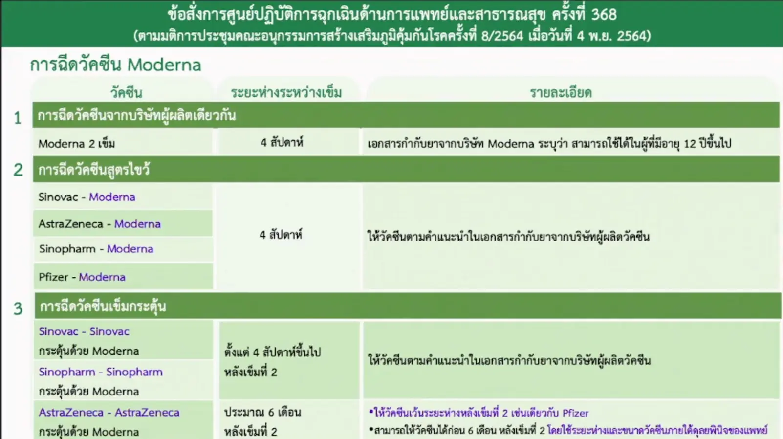 - ซิโนแวค 2 เข็ม สามารถฉีดกระตุ้นด้วยโมเดอร์นาได้ ห่างกัน 4 สัปดาห์ หลังจากรับวัคซีนเข็มที่ 2 ไปแล้ว