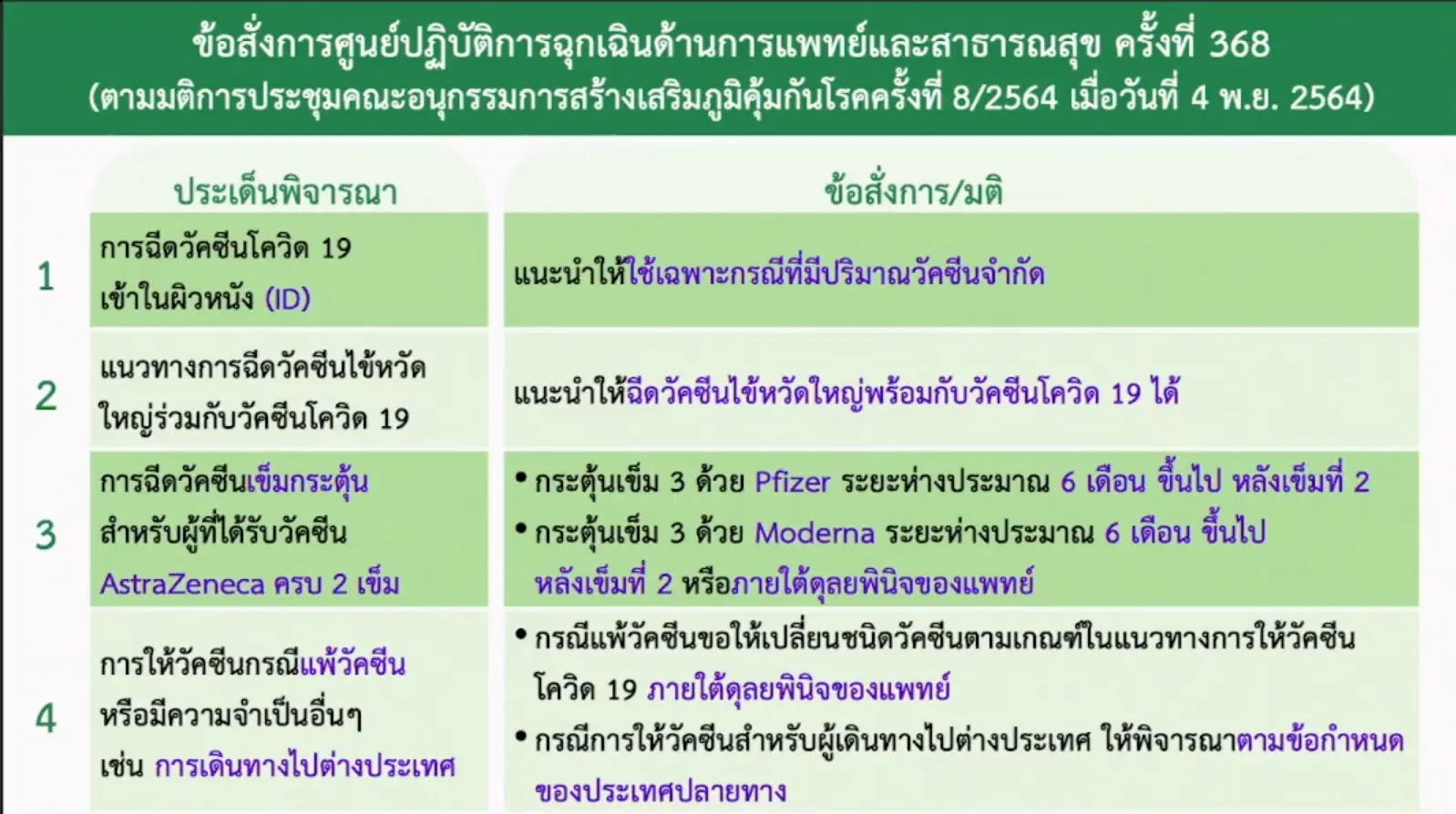 จากกรณีที่ นายแพทย์โอภาส การย์กวินพงศ์ อธิบดีกรมควบคุมโรค ได้เปิดเผยถึงการประชุมคณะอนุกรรมการสร้างเสริมภูมิคุ้มกันโรคเมื่อวานนี้ มีมติเห็นชอบเกี่ยวกับกรณี การฉีดวัคซีนเข็มกระตุ้น หรือเข็ม 3 และการฉีดวัคซีนสูตรไขว้ของไทย โดยมีสรุปรายละเอียดดังนี้