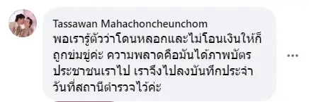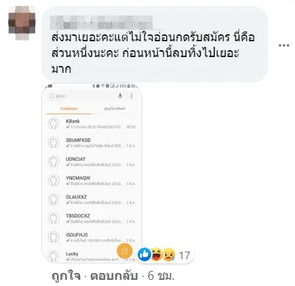 ทั้งนี้ยังได้มีชาวเน็ตได้เข้ามาแสดงความคิดเห็นว่า “พอเรารู้ตัวว่าโดนหลอกและไม่โอนเงินให้ก็ถูกข่มขู่ค่ะ ความพลาดคือมันได้ภาพบัตรประชาชนเราไป เราจึงไปลงบันทึกประจำวันที่สถานีตำรวจไว้ค่ะ” พร้อมทั้งได้มีความคิดเห็นแนะนำว่าถ้าไม่อยากโดนหลอกสามารถระงับการรับข้อความที่ไม่จำเป็นได้ด้วยการโทรออกหมายเลข *137# เพื่อป้องกันข้อความที่ไม่ใช่ข้อความของระบบเครือข่ายมือถือของมิจฉาชีพ
