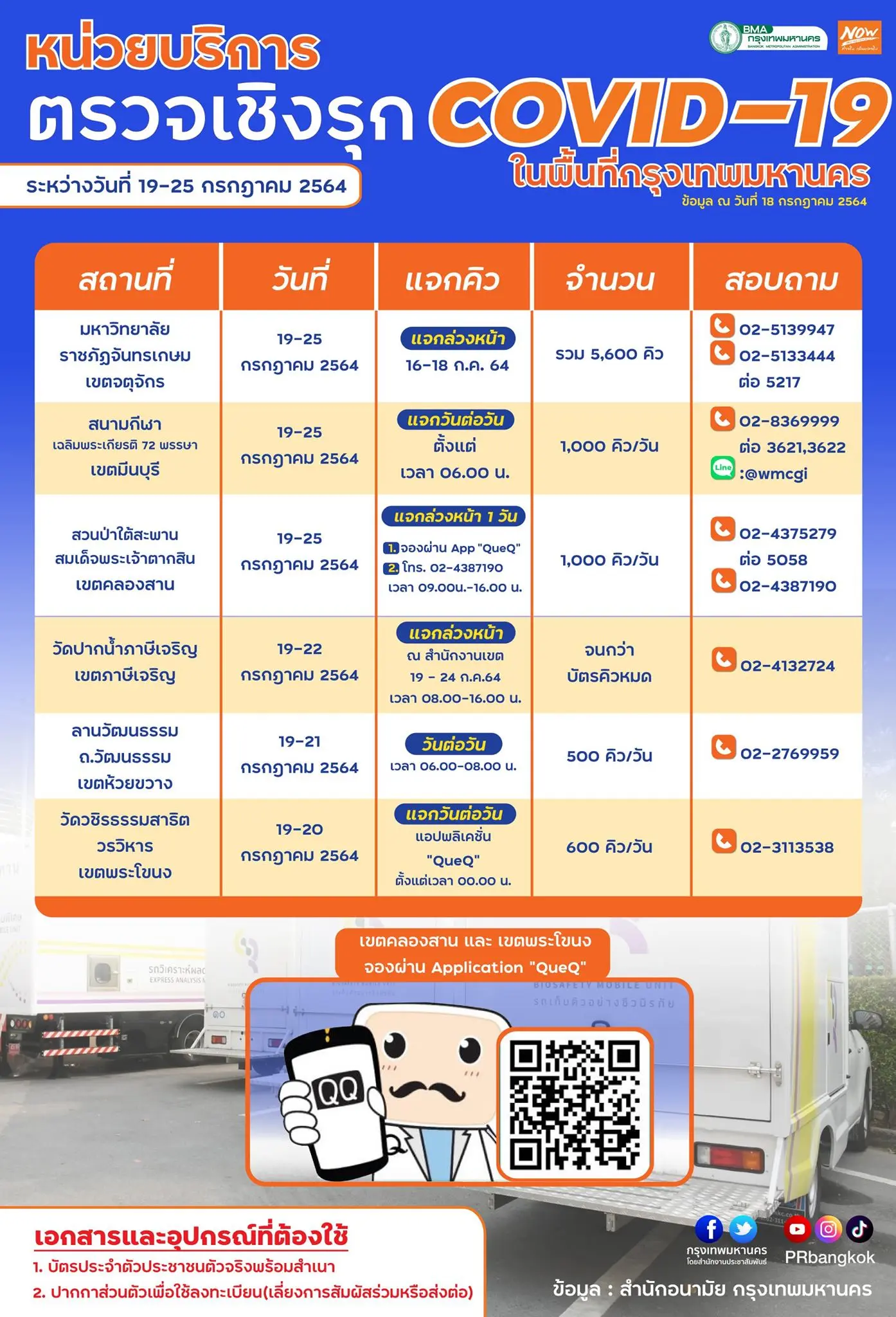 เมื่อวันที่ 19 กรกฎาคม ที่ผ่านมาเฟซบุ๊กเพจ กรุงเทพมหานคร โดยสำนักงานประชาสัมพันธ์ ได้โพสต์ข้อความประชาสัมพันธ์จุดให้บริการ ตรวจเชิงรุก COVID-19 ในพื้นที่กรุงเทพมหานครโดยจะให้บริการตรวจตั้งแต่วันที่ 19 กรกฎาคม ถึงวันที่ 25 กรกฎาคม 2564