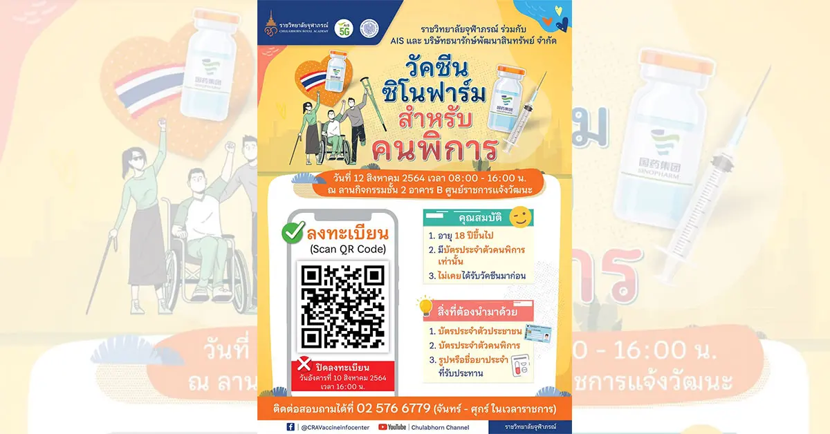 ทั้งนี้ ทางเพจเฟซบุ๊กของ โรงพยาบาลจุฬาภรณ์ ราชวิทยาลัยจุฬาภรณ์ ได้ลงประกาศเปิดลงทะเบียนขอรับวัคซีน ซิโนฟาร์ม ฟรี!! สำหรับกลุ่มผู้พิการ ซึ่งเป็นการร่วมมือระหว่าง ราชวิทยาลัยจุฬาภรณ์ ร่วมกับ AIS และ บริษัท ธนารักษ์พัฒนาสินทรัพย์ จำกัด เพื่อเข้ารับการฉีดวัคซีนในวันที่ 12 สิงหาคม 2564 เวลา 08:00 – 16:00 น.ณ ลานกิจกรรมชั้น 2 อาคารรัฐประศาสนภักดี (อาคาร