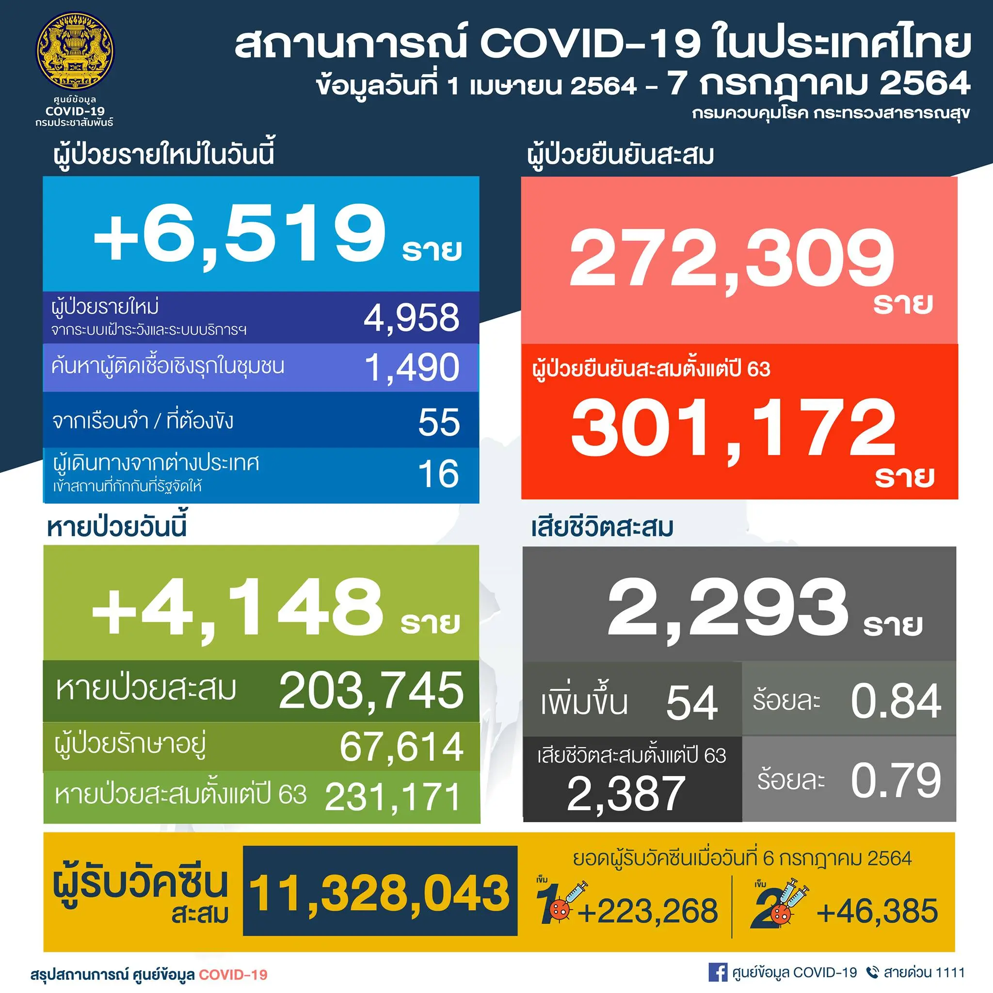 นอกจากนี้ สถานการณ์แพร่ระบาดของโควิด19 ศูนย์รายงานสถานการณ์โควิด-19 (ศบค.) รายงานยอดผู็ติดเชื้อประจำวันที่ 7 ก.ค. 64 โดยระบุว่า สถานการณ์การติดเชื้อ COVID-19 ในประเทศข้อมูลตั้งแต่วันที่ 1 เมษายน 2564 ผู้ป่วยรายใหม่ 6,519 ราย ผู้ป่วยยืนยันสะสม 272,309 ราย หายป่วยแล้ว 203,745 ราย เสียชีวิตสะสม 2,293 ราย