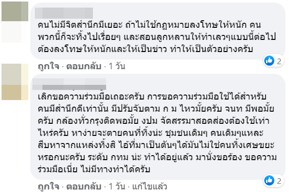 อย่างไรก็ตามหลังจากที่ทางเพจโพสต์ภาพลง ก็ได้มีชาวเน็ตจำนวนหนึ่งเข้ามาคอมเมนท์ติติง ว่าควรทำกรณีตัวอย่างขึ้นมา เพราะถ้าไม่ทำอะไร เก็บให้ตายยังไงมันก็ไม่หมด เพราะคนไม่มีจิตสำนึก!