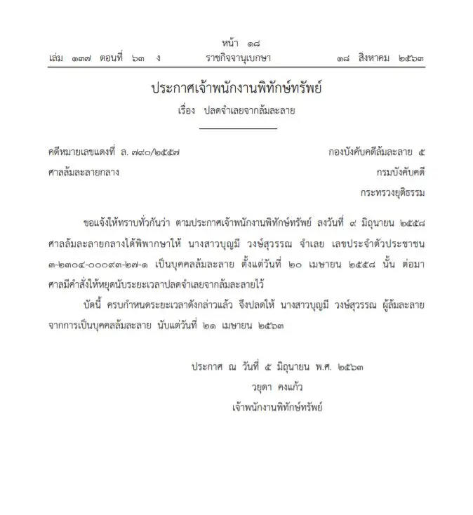 ราชกิจจานุเบกษา เผยแพร่ประกาศเจ้าพนักงานพิทักษ์ทรัพย์ ปลดจำเลยสาวนามสกุล วงษ์สุวรรณ พ้นจากการเป็นบุคคลล้มละลาย