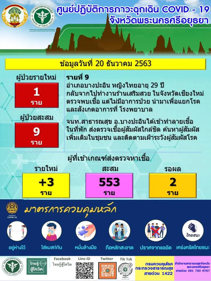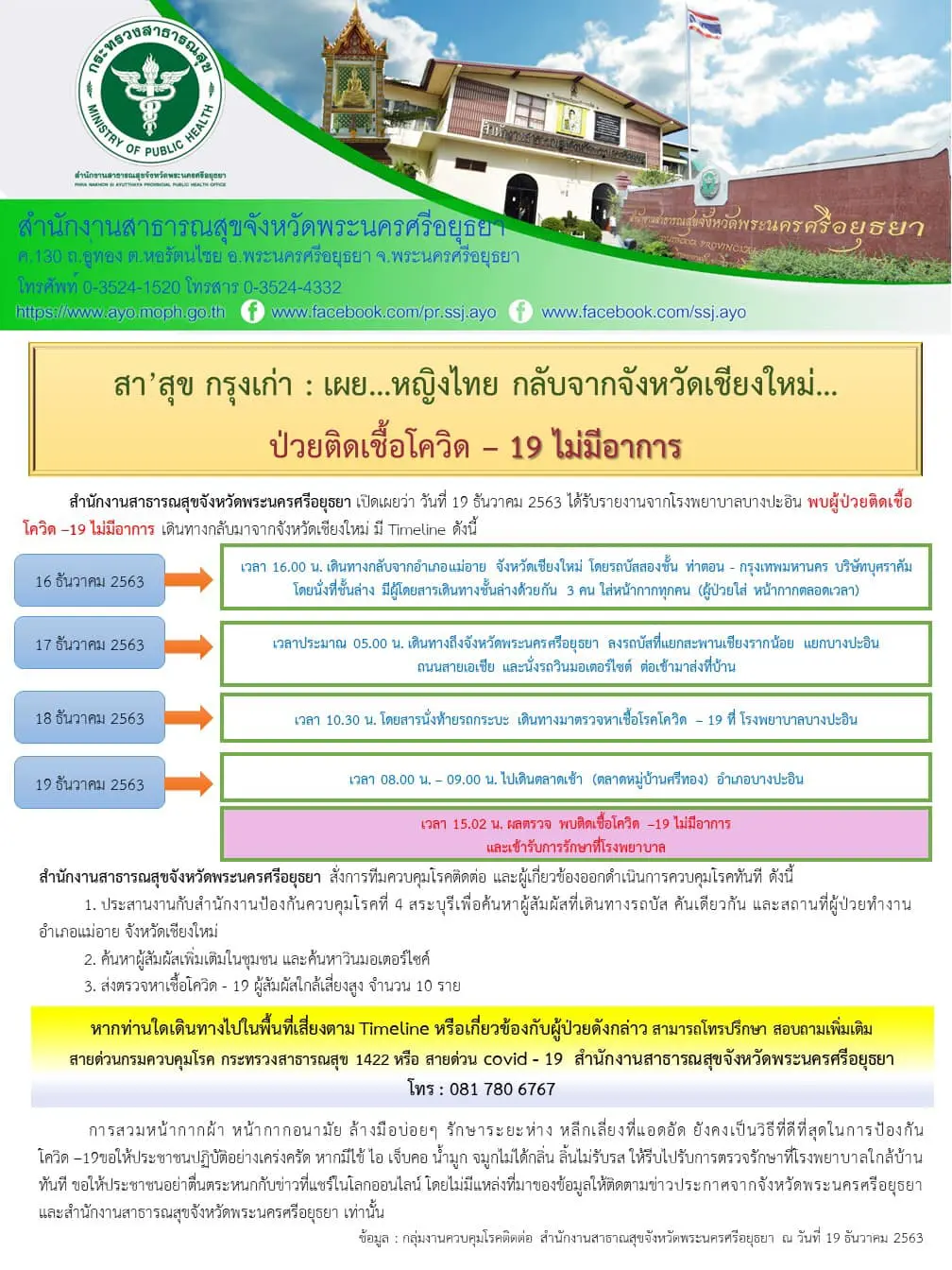 โควิดอยุธยา — (20 ธ.ค.63) งานประชาสัมพันธ์ สสจ.อยุธยา รายงานว่าจังหวัดพระนครศรีอยุธยา พบ หญิงไทยป่วยติดเชื้อ โควิด19 ไม่มีอาการ หลังจากเดินทางกลับจากการทำงานร้านเสริมสวยที่จ.เชียงใหม่