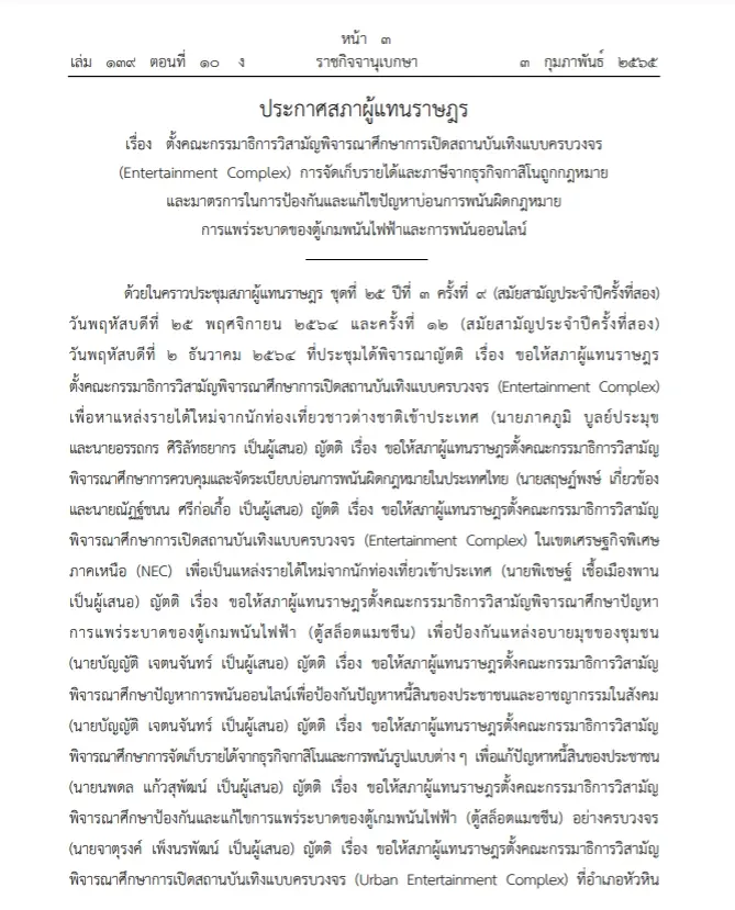 ราชกิจจานุเบกษา เผยแพร่ประกาศสภาผู้แทนราษฎร เรื่อง ตั้งคณะกรรมาธิการวิสามัญพิจารณาศึกษาการเปิดสถานบันเทิงแบบครบวงจร (Entertainment Complex) การจัดเก็บรายได้และภาษีจากธุรกิจกาสิโนถูกกฎหมาย