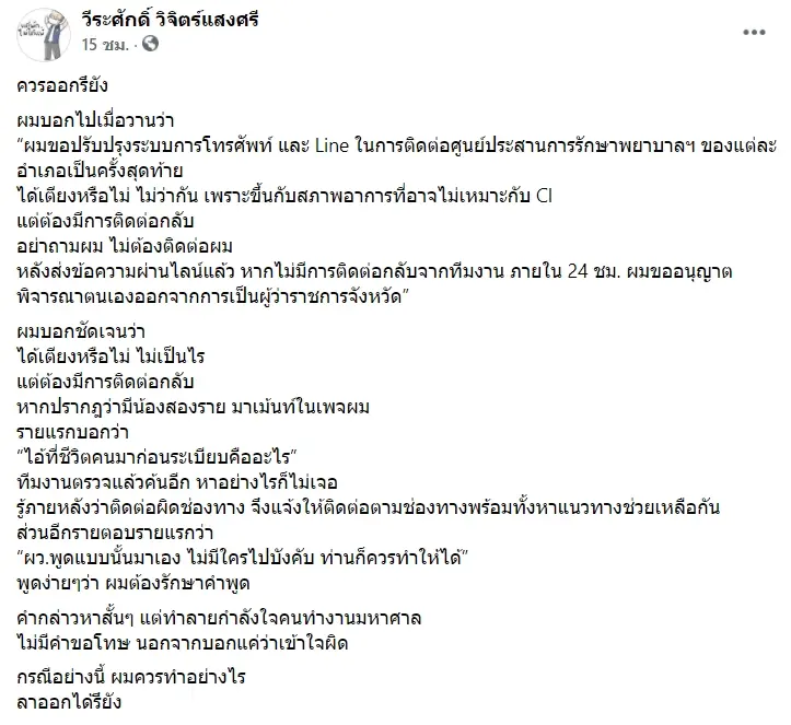 หากไม่มีการติดต่อกลับจากทีมงาน ภายใน 24 ชม. ผมขออนุญาตพิจารณาตนเองออกจากการเป็นผู้ว่าราชการจังหวัด ”ผมบอกชัดเจนว่าได้เตียงหรือไม่ ไม่เป็นไรแต่ต้องมีการติดต่อกลับหากปรากฎว่ามีน้องสองราย มาเม้นท์ในเพจผม