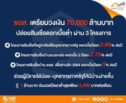 ธนาคารอาคารสงเคราะห์ (ธอส.) เพิ่มโอกาสให้กลุ่มผู้มีรายได้น้อยรวมถึงบุคลากรภาครัฐ สามารถมีที่อยู่อาศัยเป็นของตนเองได้ง่ายขึ้น ผ่าน 3 สินเชื่ออัตราดอกเบี้ยต่ำ ผ่อนสูงสุดถึง 40 ปี วงเงิน 70,000 ล้านบาท ประกอบด้วย