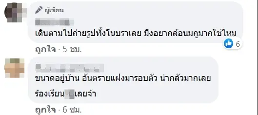 สักพักพอเขาขยับไปพ้นหน้าบ้านเรา เรากลับเข้าบ้านไปเอามือถือมาจะถ่าย แต่เขาขับรถไปแล้ว ลูกเราหน้าเสีย มาเล่าให้พี่สาวเราฟัง พี่เราโมโหเดินตามไปถามว่ามาทำอะไร ตอนนี้มันขยับไปทำงานลึกเข้าไปในซอย พี่เราเดินตามไปถ่ายรูป ติดทะเบียนมาด้วย เราเดินตามออกมายืนหน้าบ้าน ช่างตัวอ้วนตะโกนว่า “คนจะทำงานมาหาเรื่องอะไรกัน”