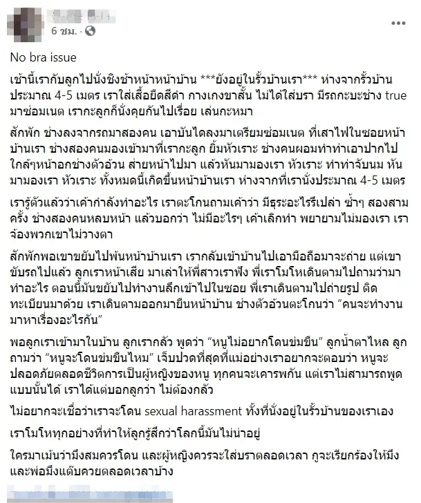 ไม่ควรมีใครโดน! สาวสุดทนโดนช่างติดเน็ตอนาจารด้วยสายตา-ท่าทาง เหตุ โนบราหน้าบ้าน ลูกสาวผวากลัวโดนข่มขืนชาวเน็ตแนะควรร้องเรียน
