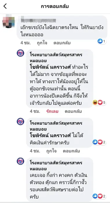 หลังจากนั้นก็ได้มีชาวเน็ตเข้าไปสอบถามอาการของน้องปีเอตร์ว่ารอดหรือไม่ ทางหมอก็ได้เข้าไปตอบว่า ทางเราให้น้องอยู่ในตู้ออกซิเจนเท่านั้น ตอนนี้อาการน้องปีเตอร์ดีขึ้นจึงให้เจ้าของมารับกัลบไปดูแลต่อแล้ว” พร้อมกับรุบุข้อความเพิ่มเติมว่า สำหรับกรณีนี้ทางโรงพยาบาลไม่คิดค่ารักษาแต่อย่างใด