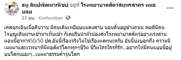 เมื่อวันที่ 25 พ.ค. ที่ผ่านมา โลกออนไลน์ได้แชร์เรื่องราวการช่วยชีวิตของเจ้าปีเตอร์หรือแมลงสาบที่ประสบอุบัติเหตุโดนรถเหยียบข้างถนนผ่านทางเฟซบุ๊กส่วนตัวของหมอบอย หรือ นายสัตวแพทย์ธนู ลิมปพัฒนวณิชย์ โดยหมอบอยได้ระบุข้อความเอาไว้ว่า