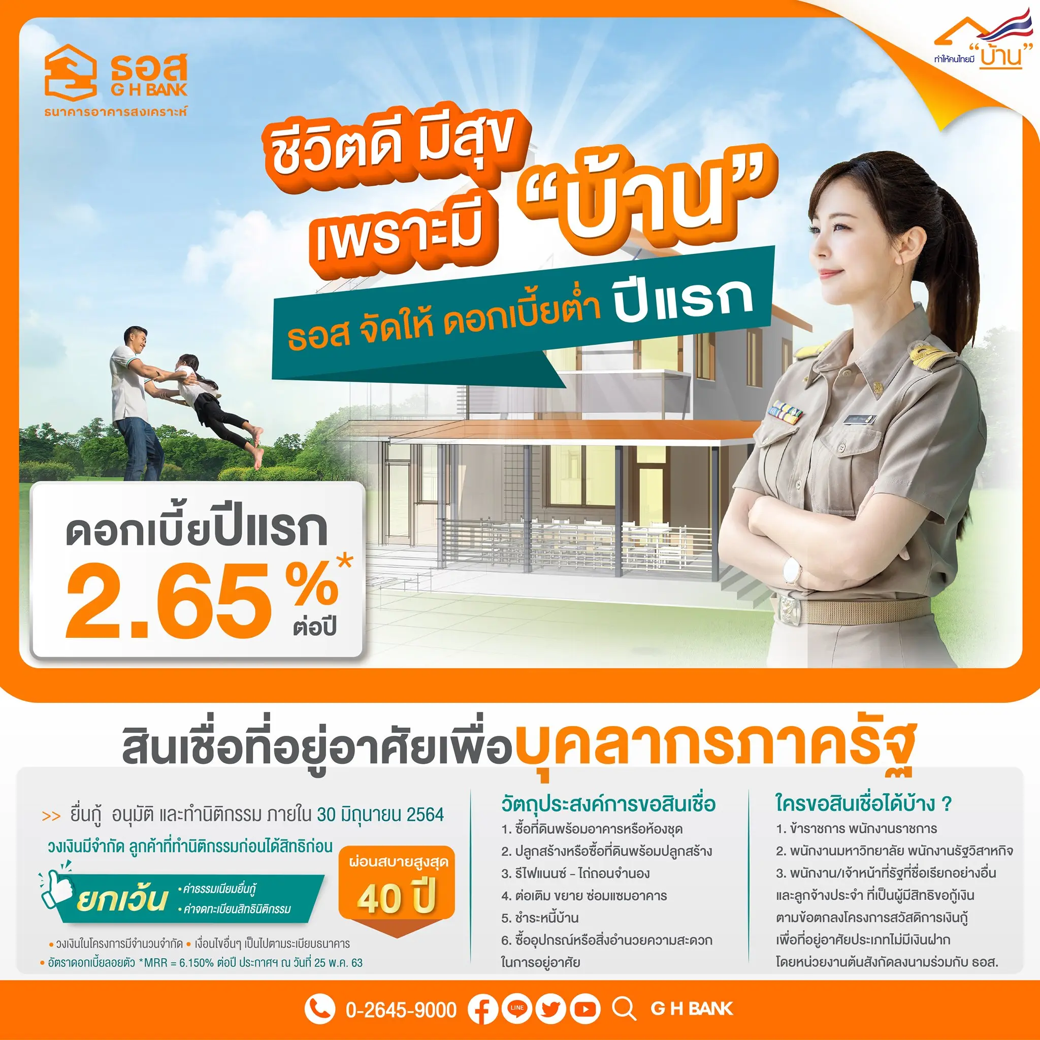 3.สินเชื่อที่อยู่อาศัยเพื่อบุคลากรภาครัฐ ดอกเบี้ยปีแรก 2.65%* ต่อปี ฟรีค่าธรรมเนียม ผ่อนนานสูงสุด 40 ปี
