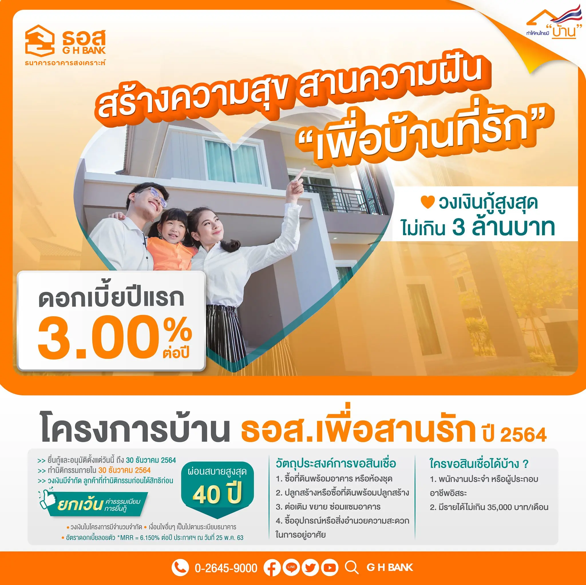 - โครงการบ้าน ธอส. เพื่อสานรัก ดอกเบี้ยปีแรก 3.00%* ต่อปี ฟรีค่าธรรมเนียมการยื่นกู้ ผ่อนนานสูงสุด 40 ปี วงเงินกู้สูงสุดไม่เกิน 3 ล้านบาท