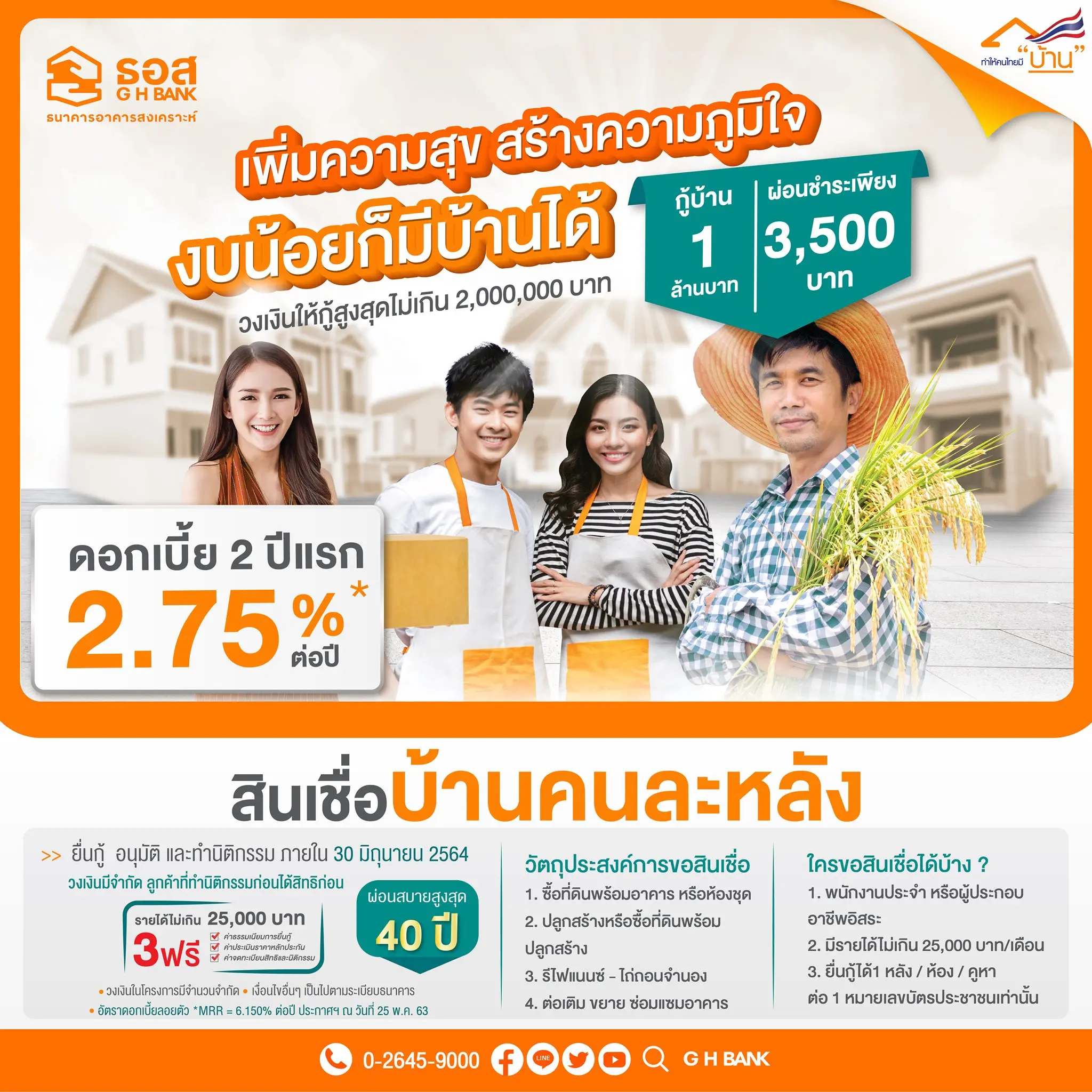 - สินเชื่อบ้านคนละหลัง ผ่อนชำระเพียง 3,500 บาท ดอกเบี้ย 2 ปีแรก 2.75%* ต่อปี ฟรีค่าธรรมเนียม ผ่อนนานสูงสุด 40 ปี วงเงินกู้สูงสุดไม่เกิน 2 ล้านบาท