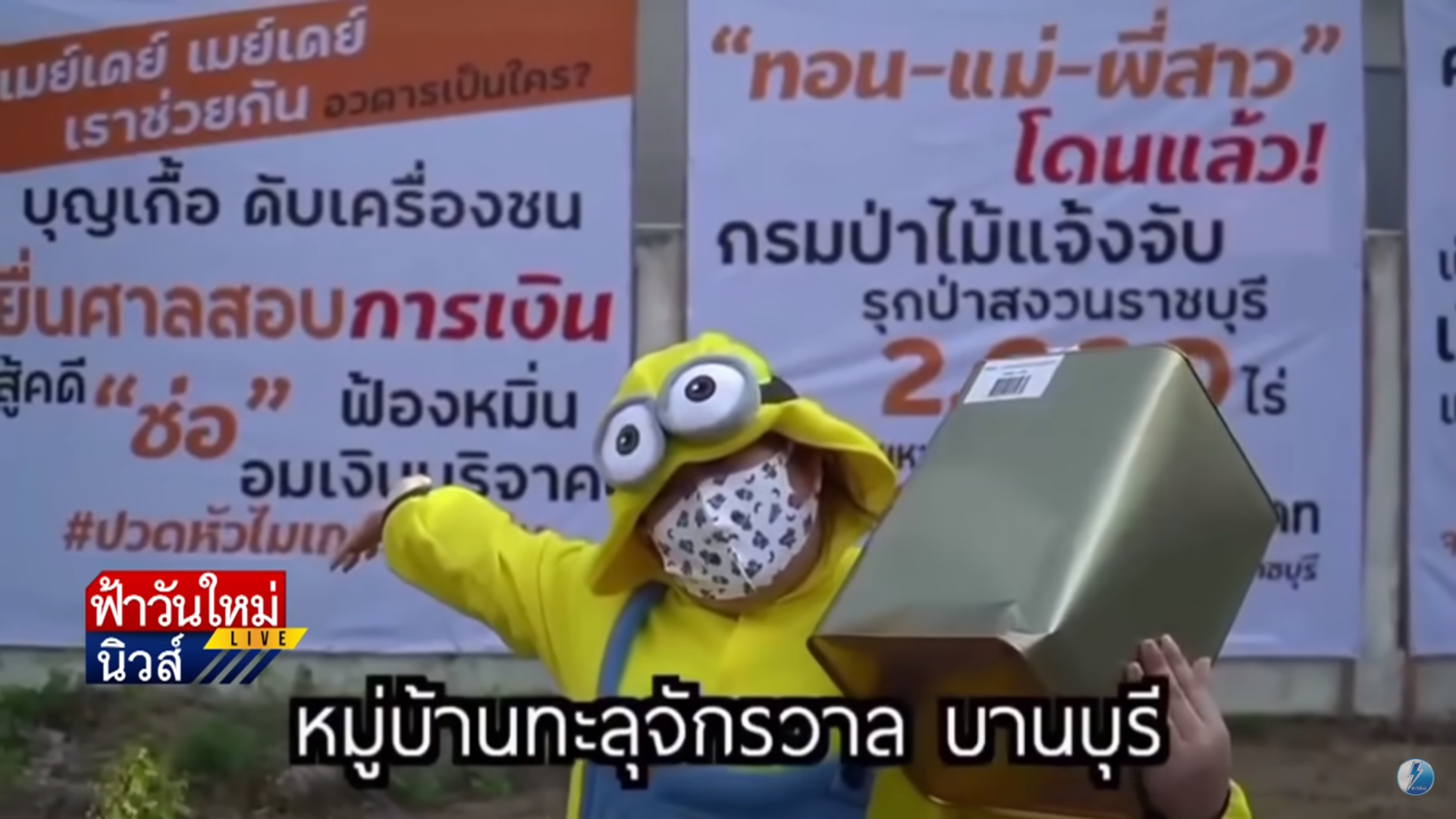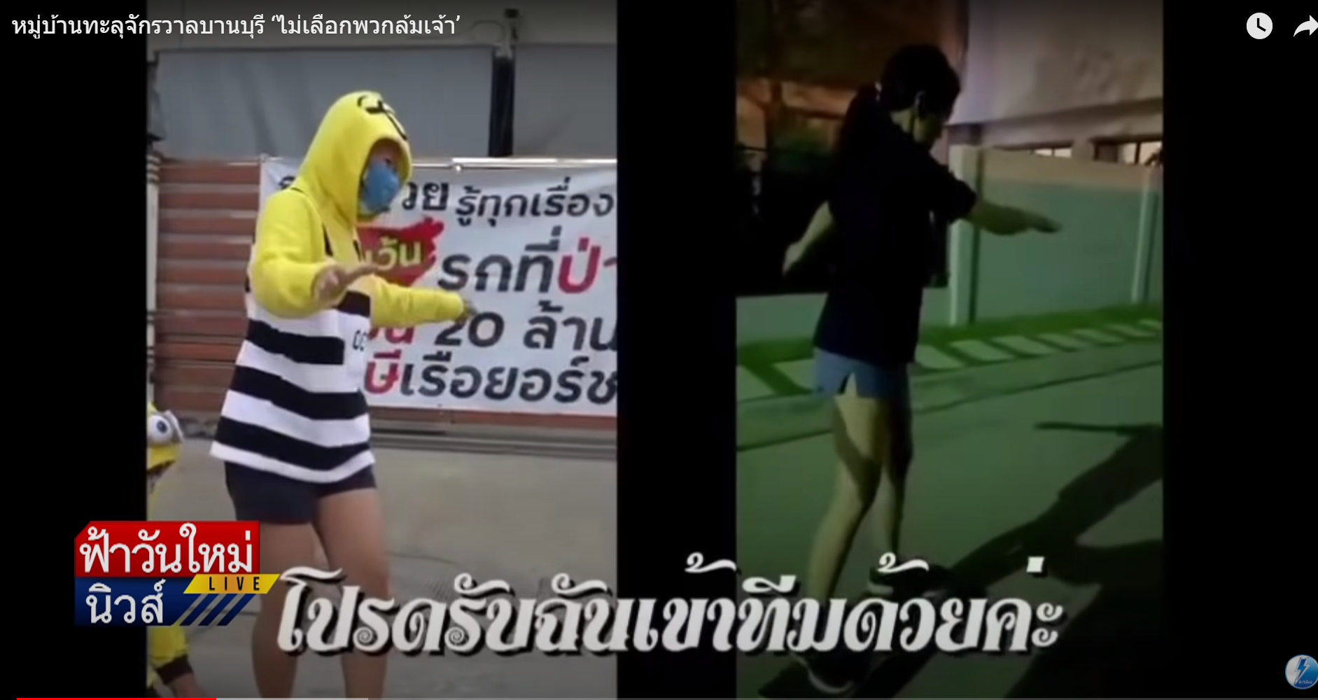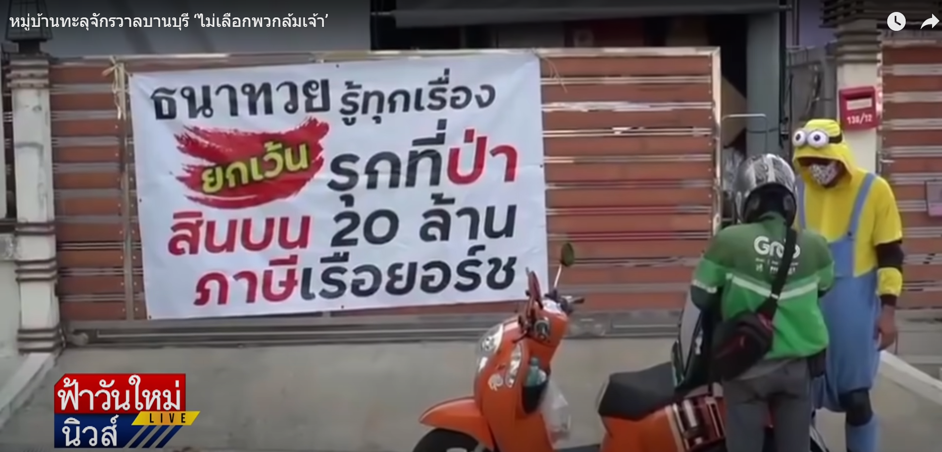 ส่วนที่ประตูรั้วบ้านก็มีป้ายไวนิล มีเนื้อหาโจมตี นายธนาธร จึงรุ่งเรืองกิจ ประธานคณะก้าวหน้า ที่มีข้อความเขียนว่า “ธนาทวยรู้ทุกเรื่อง ยกเว้นรุกที่ป่า สินบน 20 ล้าน ภาษีเรือยอร์ช”