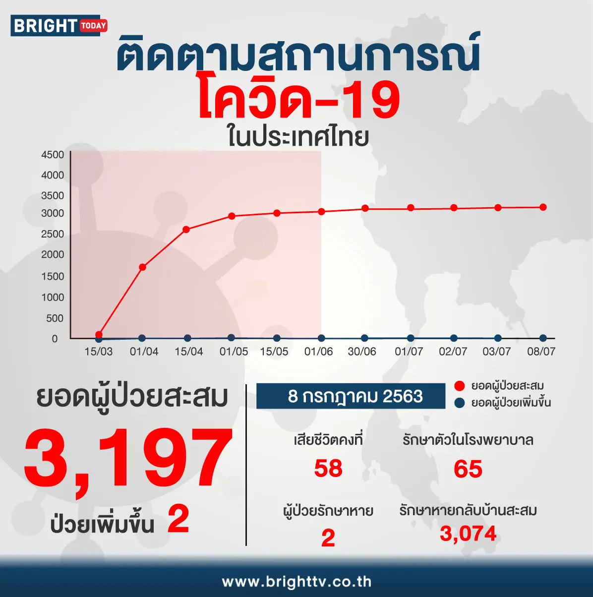 วันนี้ ผู้ติดเชื้อรายใหม่ 2 ราย ยอดผู้ติดเชื้อสะสมขณะนี้ 3,197 ราย ไม่มีผู้เสียชีวิตเพิ่ม รวมยอดเสียชีวิตสะสม 58 ราย หายป่วยกลับบ้านได้เพิ่มอีก 2 ราย รวมยอดหายป่วยสะสม 3,074 ราย และรักษาตัวอยู่ในโรงพยาบาล 65 ราย ซึ่งผู้ติดเชื้อภายในประเทศยังอยู่ที่ 0 ราย ต่อเนื่องเป็นวันที่ 44