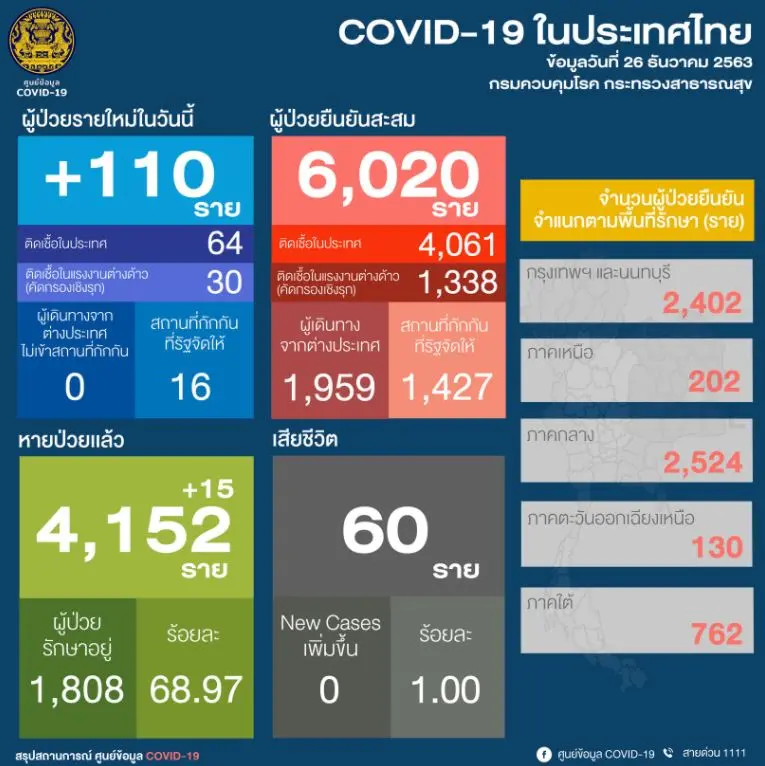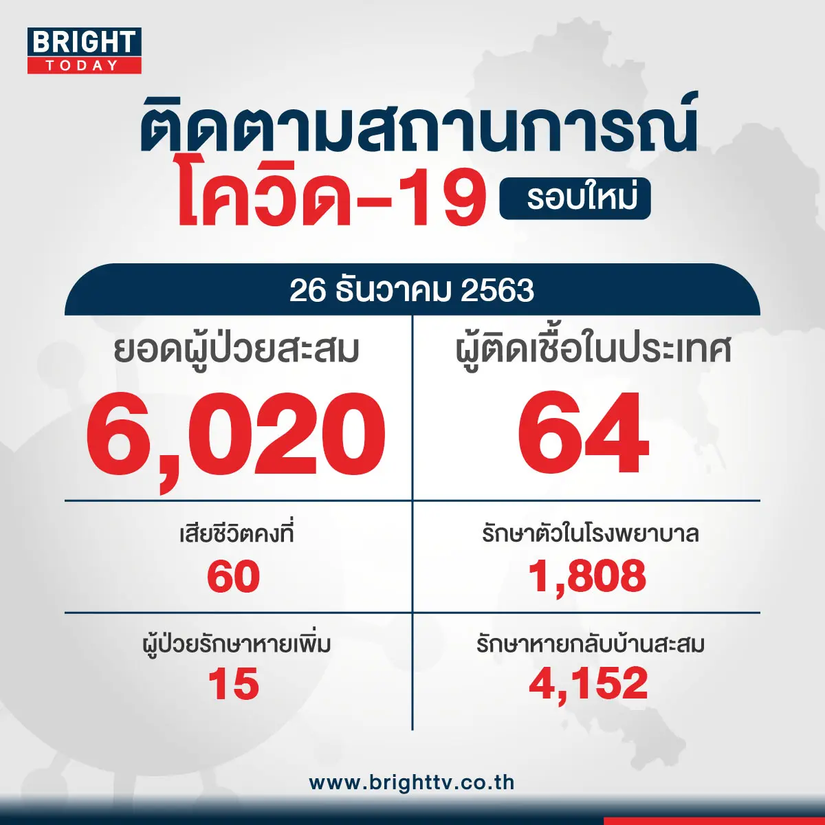26 ธ.ค. 63 ศูนย์บริหารสถานการณ์การแพร่ระบาดของโรคติดเชื้อไวรัสโคโรนา2019 (โควิด-19) หรือ ศบค. รายงานสถานการณ์การแพร่ระบาดโควิด-19 ในประเทศไทยประจำวันนี้ มีดังนี้