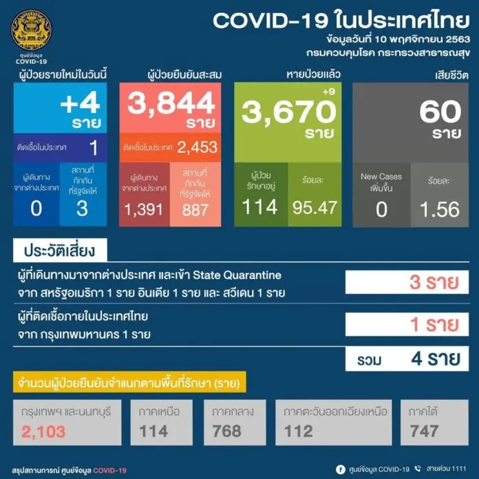 วันอังคารที่ 10 พฤศจิกายน 2563 เวลา 11.00 น. สถานการณ์การติดเชื้อโควิด-19 มีผู้ป่วยรายใหม่ 4 ราย รวมสะสม 3,844 ราย แบ่งเป็นการติดเชื้อในประเทศ 2,453 ราย และเป็นผู้เดินทางมาจากต่างประเทศ 1,391 ราย รักษาหายป่วยแล้ว 3,670 ราย ยังรักษาอยู่ในโรงพยาบาล(รพ.) 114 ราย เสียชีวิตสะสม 60 ราย ทั้งนี้ในจำนวนผู้ป่วยสะสม 3,844 ราย รับรักษาในกรุงเทพมหานคร(กทม.) และนนทบุรีจำนวน 2,103 ราย ภาคเหนือ 114 ราย ภาคกลาง 768 ราย ภาคตะวันออกเฉียงเหนือ 112 ราย ภาคใต้ 747 ราย